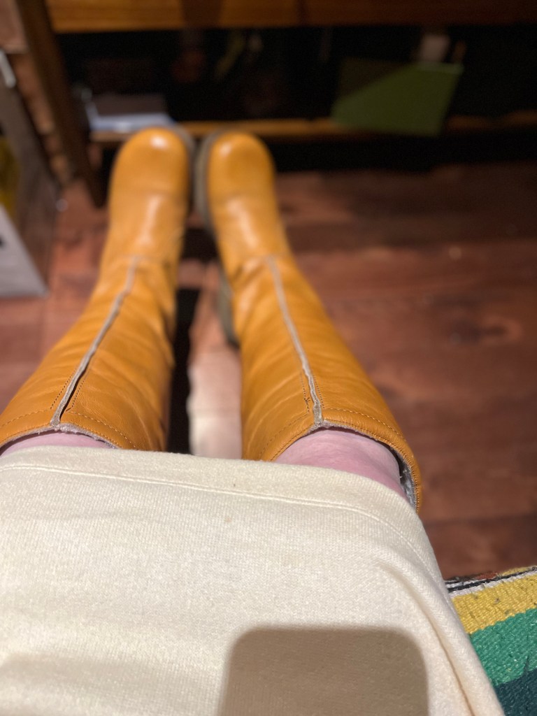 Tonight at the VV I got lucky and found this pair of lined, knee-high leather boots. Mr. Andrew calls this colour Cougar Boot Tan. They do need to new insoles. And they are not quite all purpose boot I was trying to manifest (that would be black). I could not say no to them, however, because the height was something I’ve always aspired to but my sturdy legs usually mean that I can’t get them tall boots past mid-calf.
