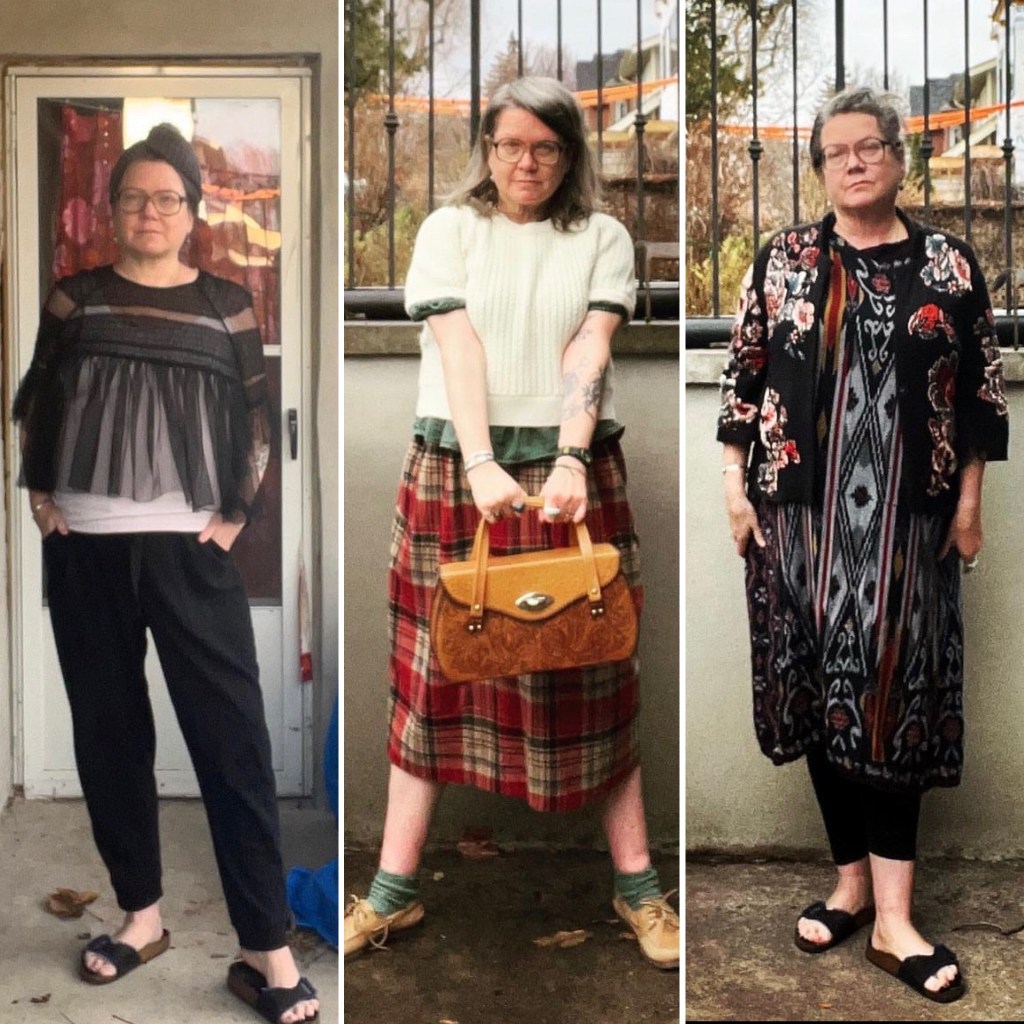 Above from left to right: I saw a picture of someone wearing a black tulle top over a white undershirt so I immediately pulled this Zara top from the Poshmark pile; this ensemble was sort of informed by Pinterest in that I went to the Value Village in search of a sweater I could upcycle but also came home with this Pendleton skirt and vintage tooled leather purse; And the intarsia cardigan and Ikat tunic pairing is based on a pin of Joan Juliet Buck doing yoga in a field wearing a similar style.