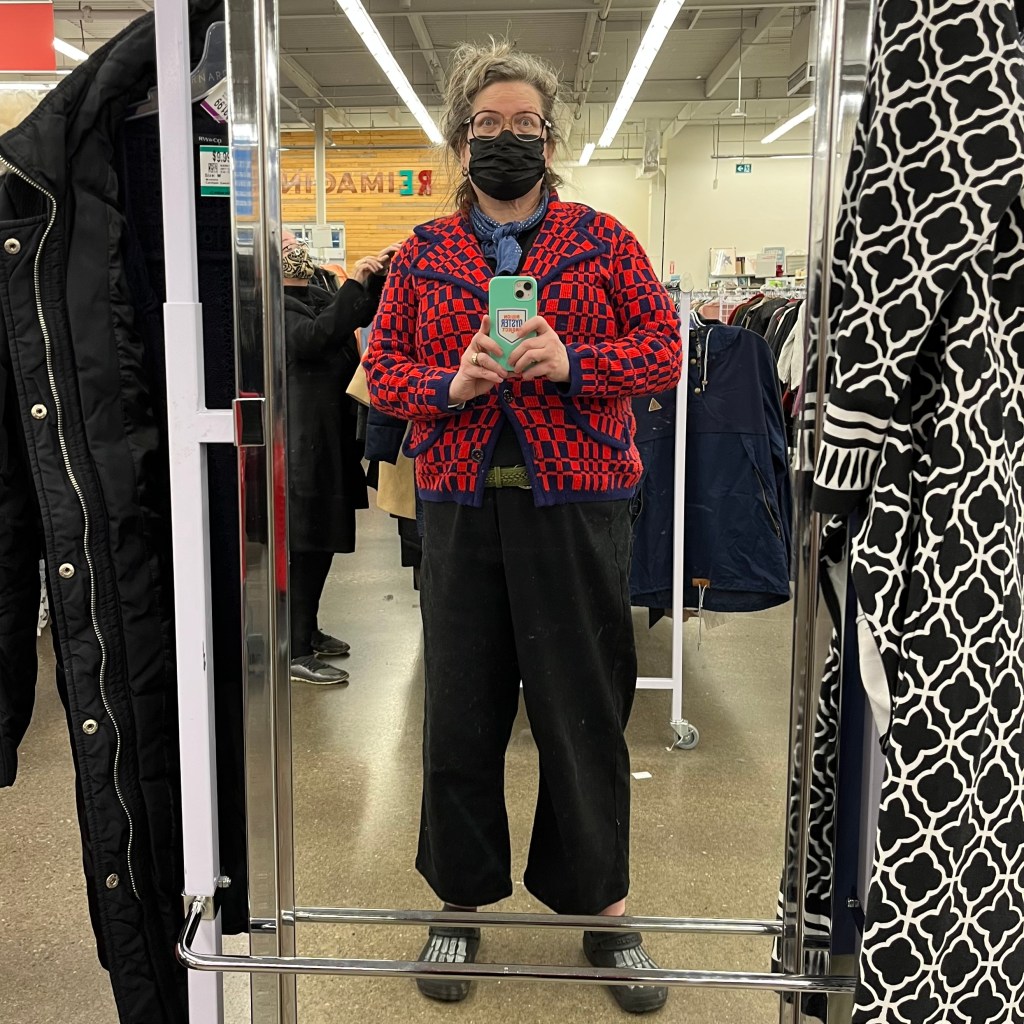 During these dreary January days, I’m definitely leaning toward fun clothes. The weather has been so overcast and rainy this week that I haven’t left the house for days. I visited the Value Village last night just to get my steps in. And although the old closet is just about bursting at the seams again (I will Poshmark some surplus tomorrow), I could not resist these colourful and kooky finds.