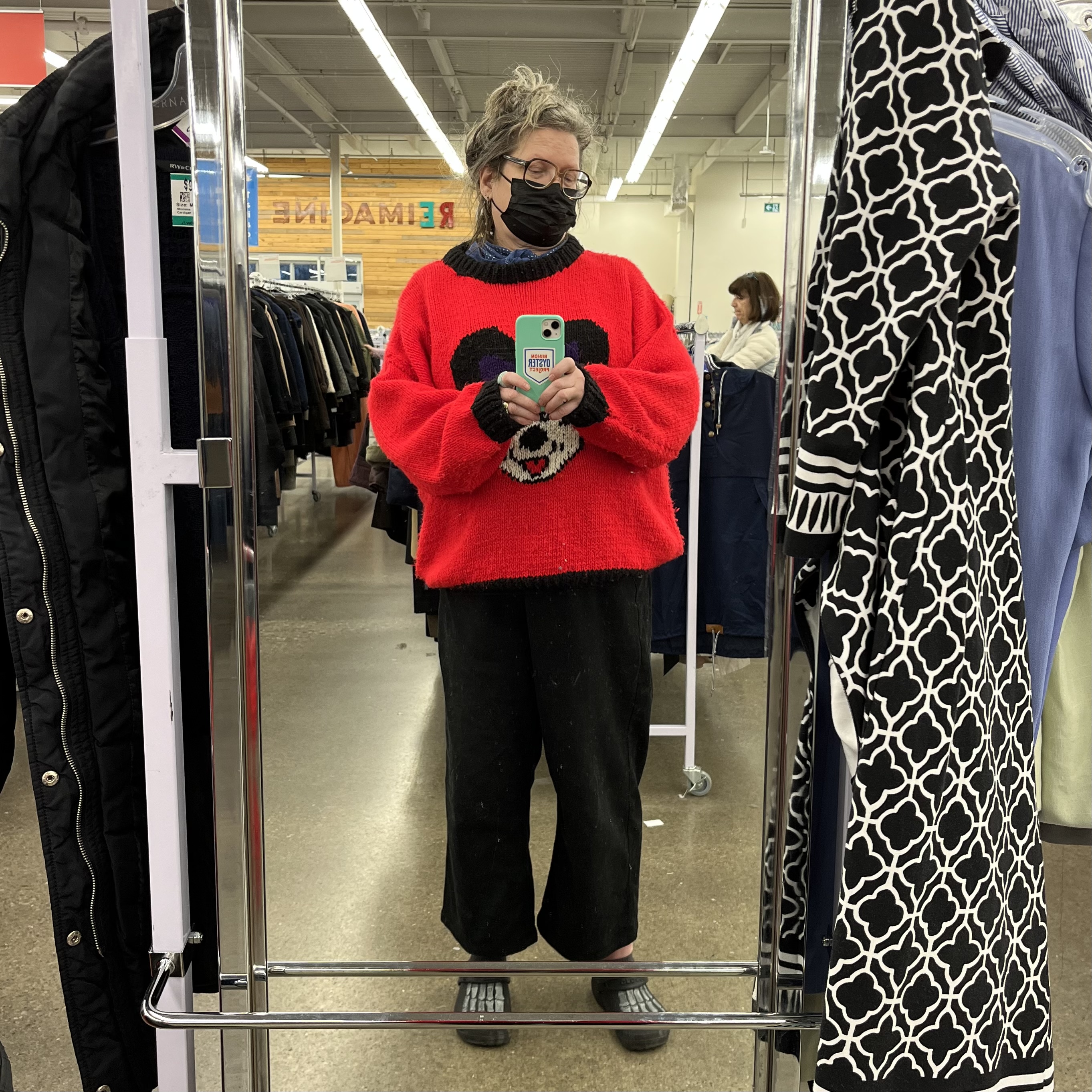 I got the world’s greatest handknit Mini Mouse sweater and a red and blue geometric design blazer. Both very vintage. Both $5.99.