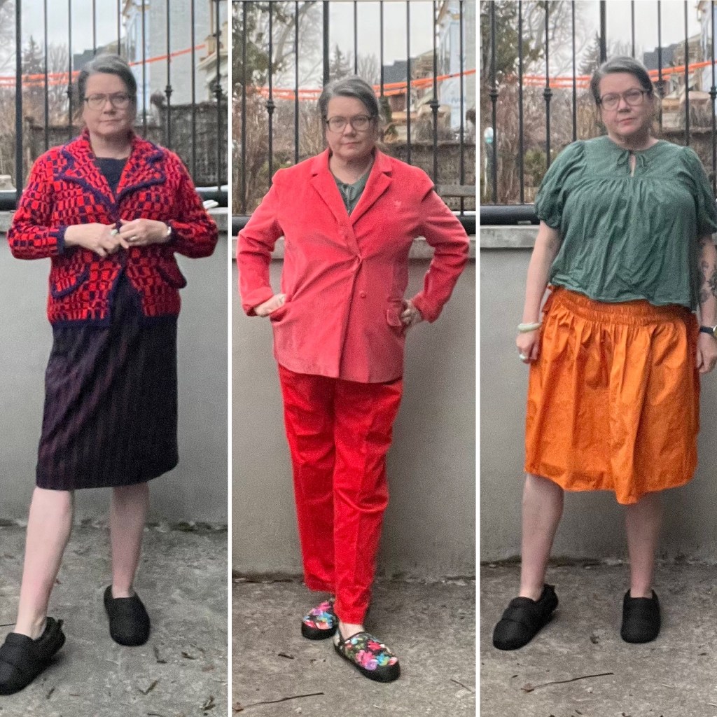 And finally, the far right photo is a skirt that doesn’t quite close. Still doesn’t. But it doesn’t ride up like it used to when I wear it without the trainer.