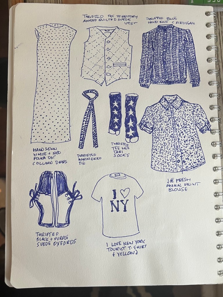 And now that I’m looking at these drawings I forgot a Honeybea sweater. I’ve long wanted one of these upcycled pieces so I greedily grabbed one when I found it on the rack at Value Village. I need to learn restraint and leave things for others.