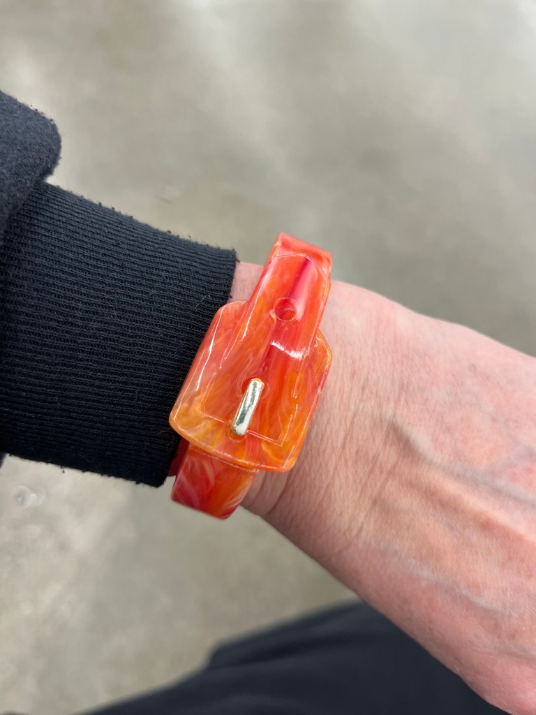 I also enjoy a belt every now and then. I found this swirly plastic clamper bracelet at the Value Village last week. It’s missing a silvery bit but that’s okay. Bonus points for being orange.