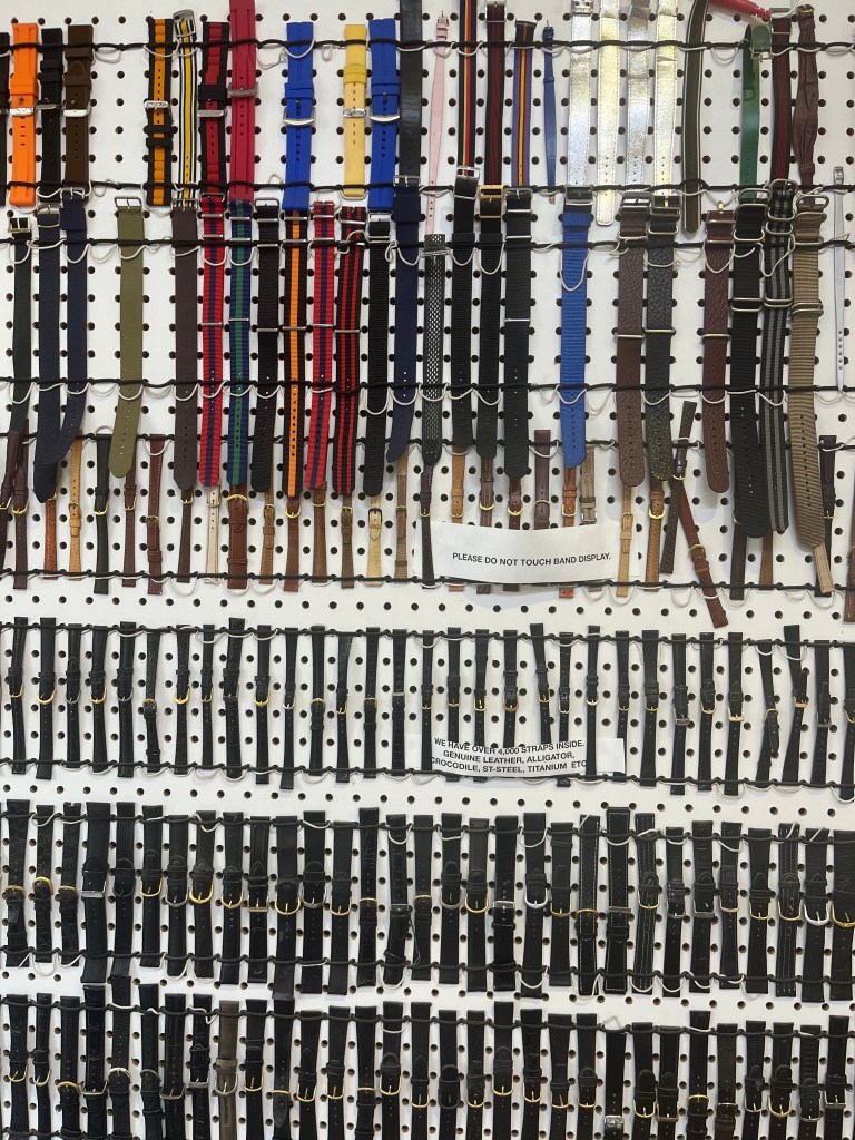 In an attempt to buy less clothing for myself I am instead purchasing new outfits for my watches. Since most of my timepieces are vintage, I’ve been seeking New Old Stock straps. For example, my Winnie The Pooh “Crash” (aka the Poohtier), originally came with a braided leather strap. So I headed to Canadian Watch Repair on Spadina which has a whole wall of vintage straps. Even though they are unworn, the old leather can dry out, but I found one that was still supple.