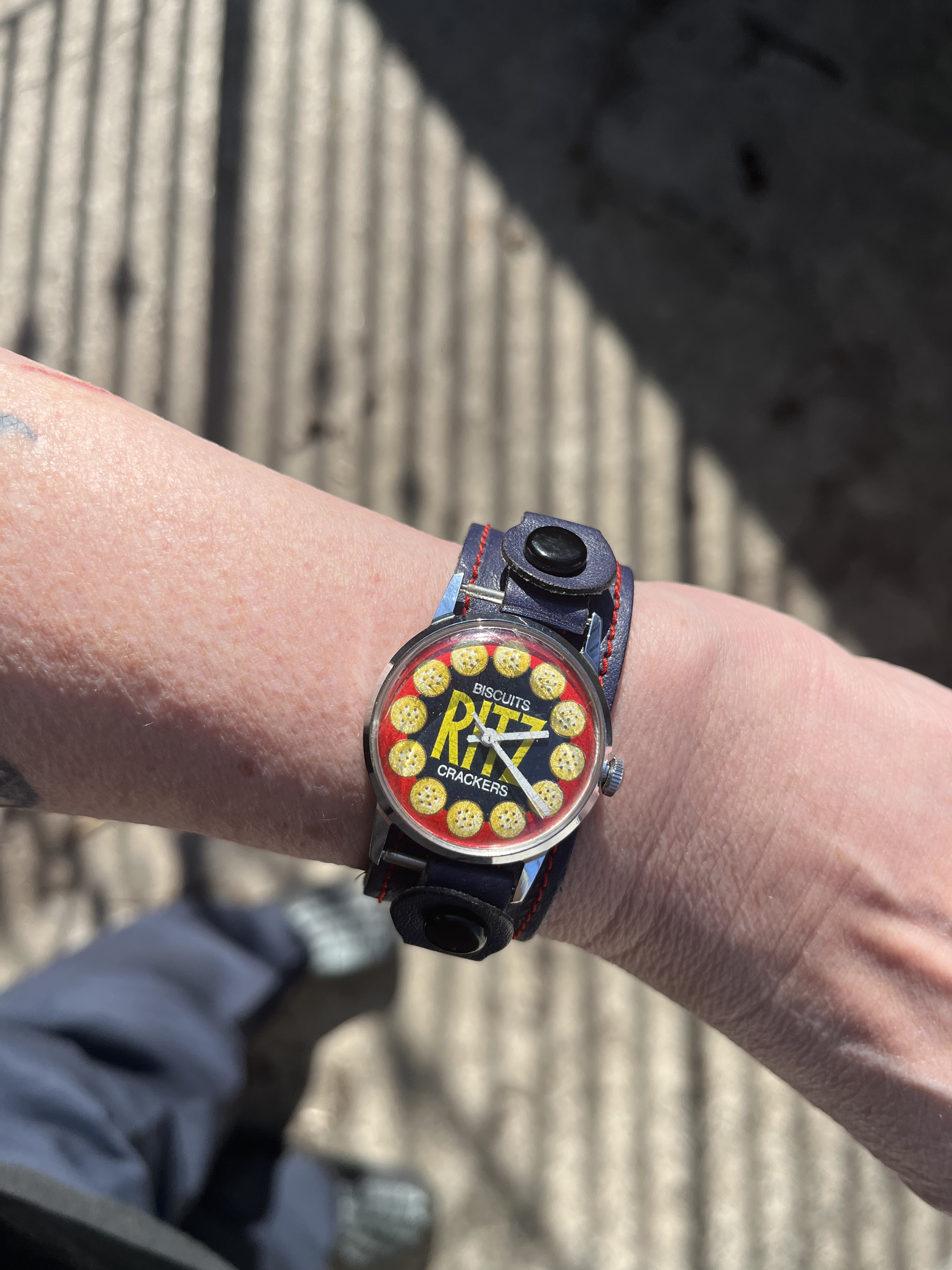 And finally, in the weekend, I came across a hoard of leather bund straps. I didn’t buy them all but I was hoping that the blue one would suit my Ritz Crackers Watch.