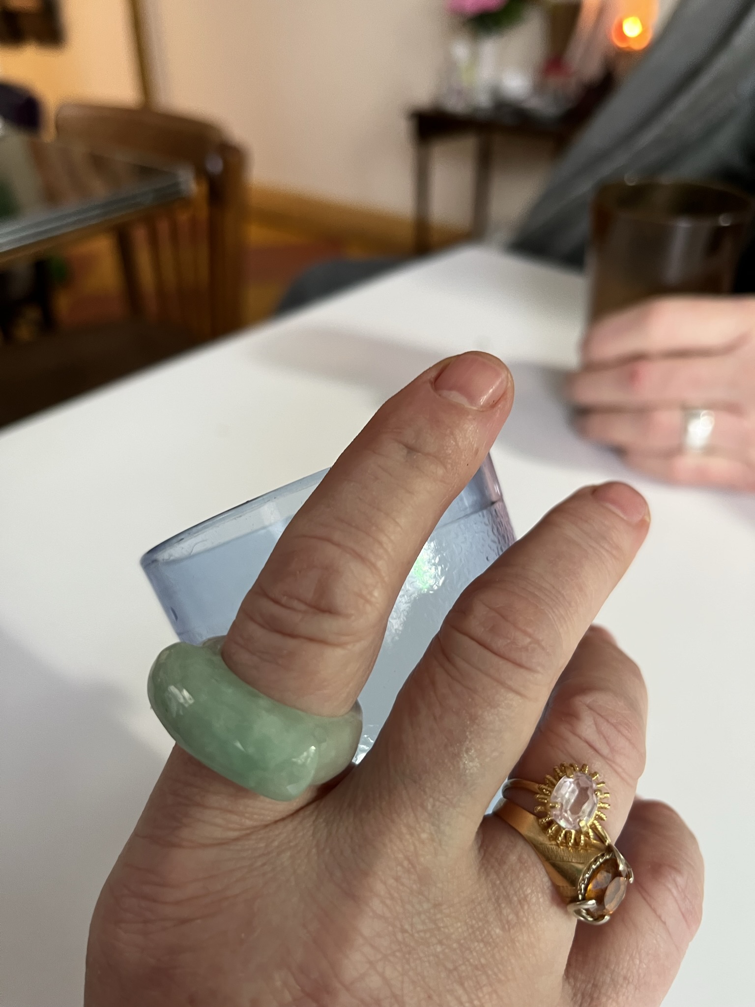 I saw and liked these retro sixties cocktail rings at the thrift but was not going to buy because I have too many rings. Then I thought, maybe I’ll just get one and went back to the jewelry counter. There were two pickers berating the sales clerk basically calling them garbage and demanding that she reprice them for $25. One of them saw the first one looking at them and muscled in front of me in line. I waited until they backed off and then bought both just to spite them.