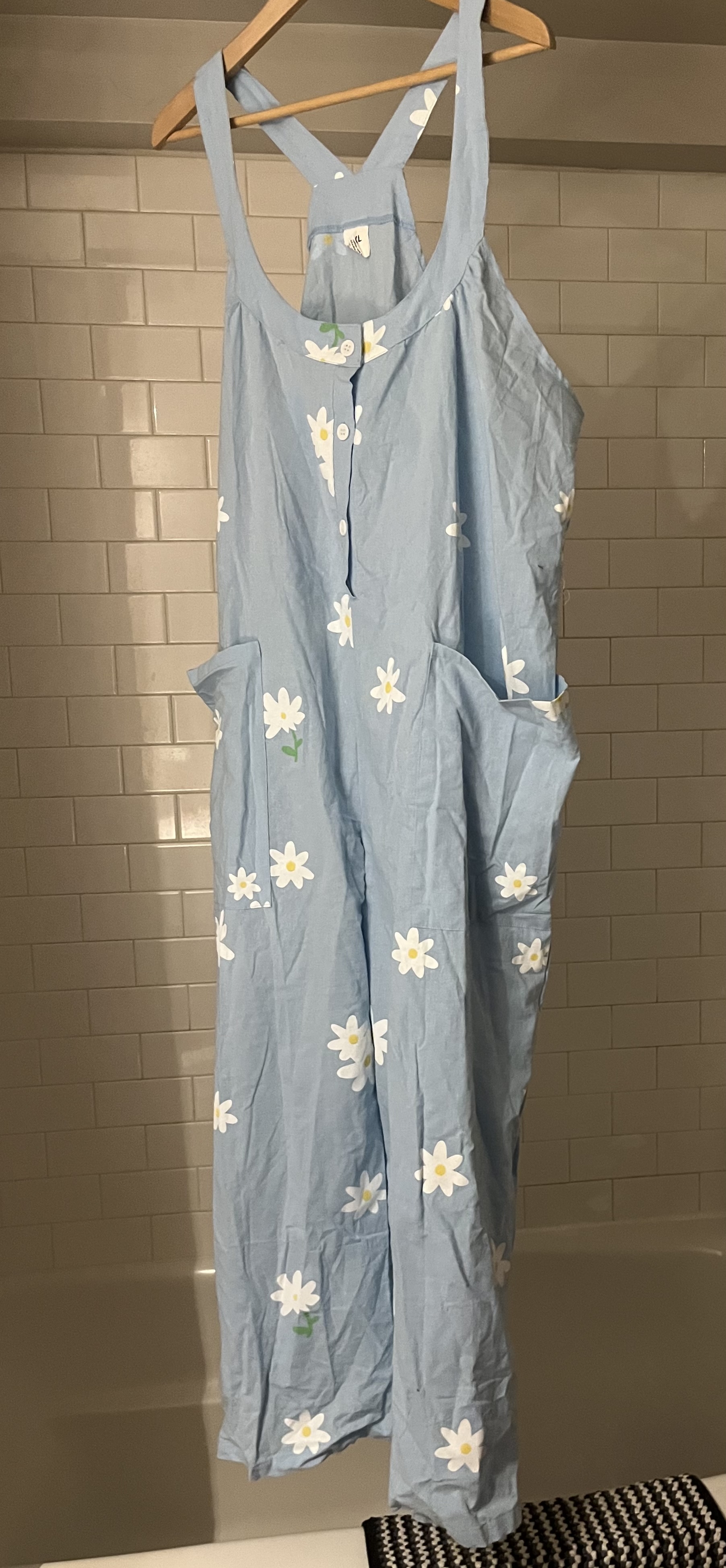 I thrifted this daisy age jumpsuit (because one pieces ate another thing I can’t resist) and assumed it would fit because the size tag said 5L. But you should never assume anything. In this case, the garment was plenty wide enough but the rise was the problem. I did not realize just how uncomfortable this jumpsuit was until after I tied it on at home.