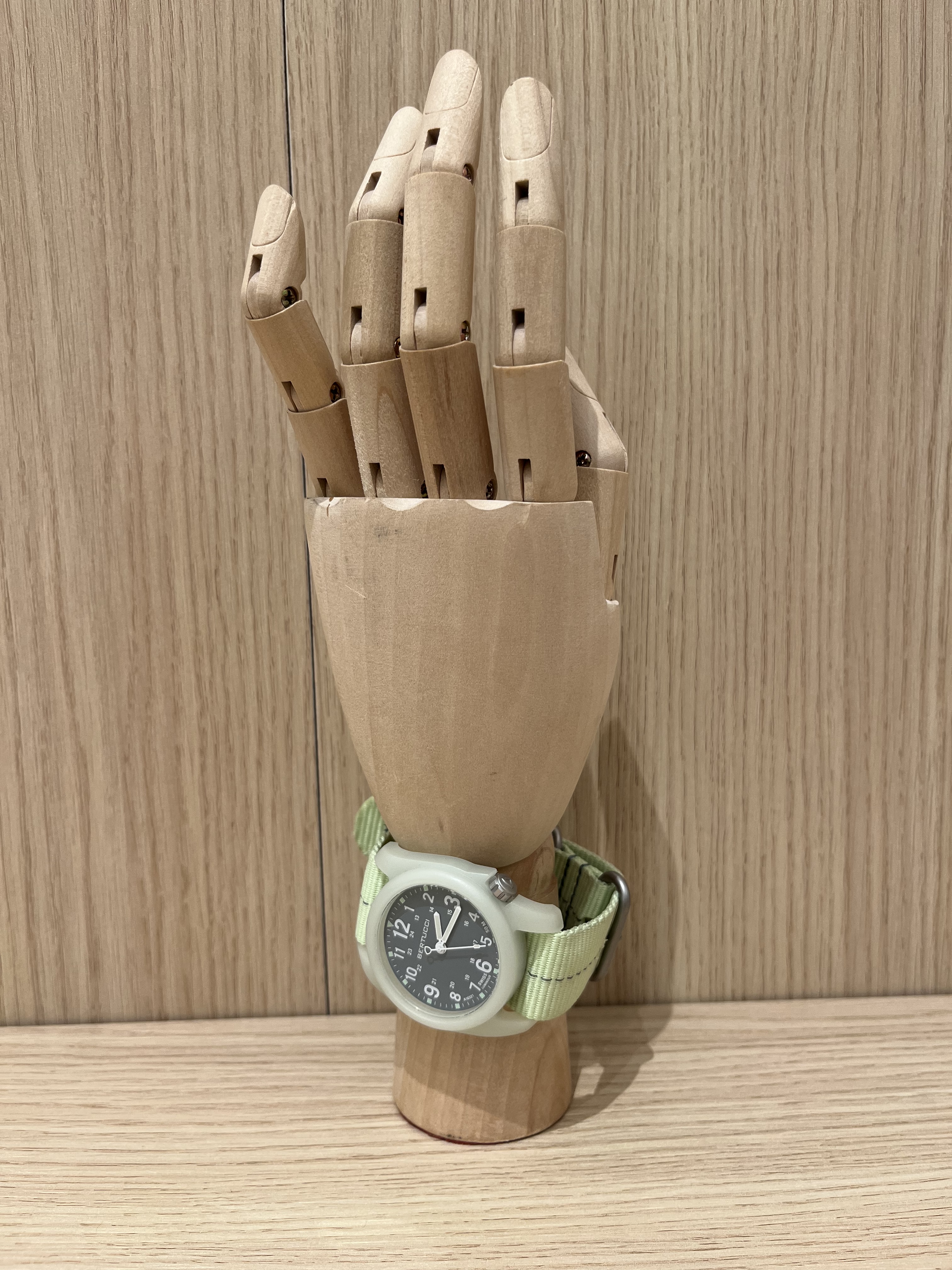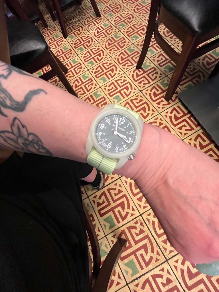 First off is Baby’s first field watch. It is from a company called Bertucci and I saw it posted on an Instagram account that I follow called @readysetwatch. This time piece is minty green by day and TOTALLY GLOW-IN-THE-DARK by night. Even the strap glows! I love the case shape, the grey dial and the offset crown but it was the lume that got me impulse buying this watch at 3am.