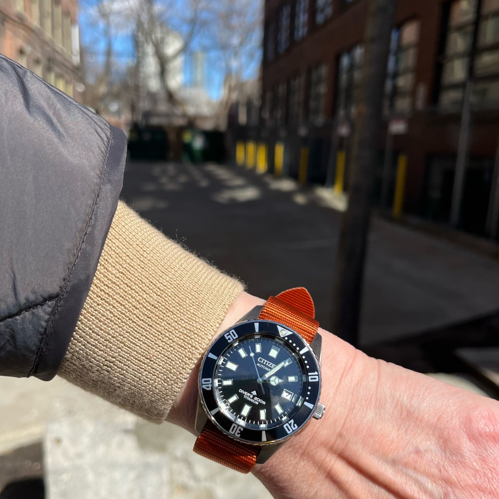 Speaking of impulse shopping online, Ricardo from @readysetwatch also posted a picture of his Citizen Promaster Mechanical Diver 200m “Fujitsubo” on a rust-coloured nylon pull through strap from a company called ADPT and I totally had to copy this look too. I’m very suggestible.