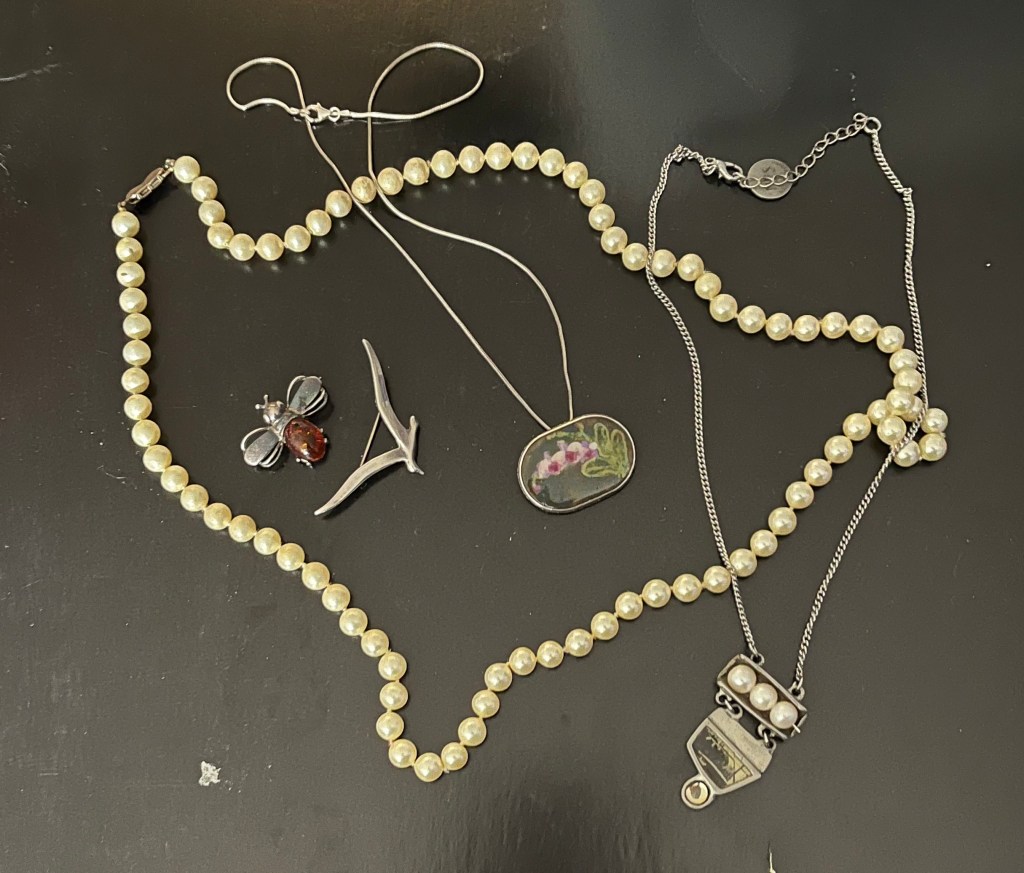 Fortunately I keep a stash of loose pearls lying about and was able to reset it within minutes (I also picked out a few other pieces like the Viking ship and the necklaces and brooches pictured up top). I’m honoured to be part of Ilsa’s story.