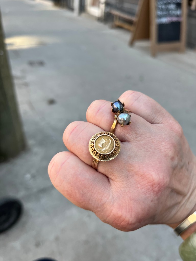 On the weekend, her husband John brought Ilsa’s jewelry box to see if we wanted anything (his daughter-in-laws and granddaughters had already chosen their favourites). I picked out a broken bypass ring because I am drawn to things that need fixing.