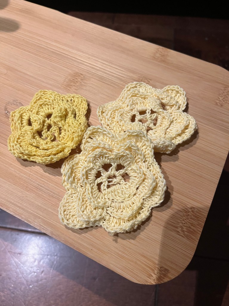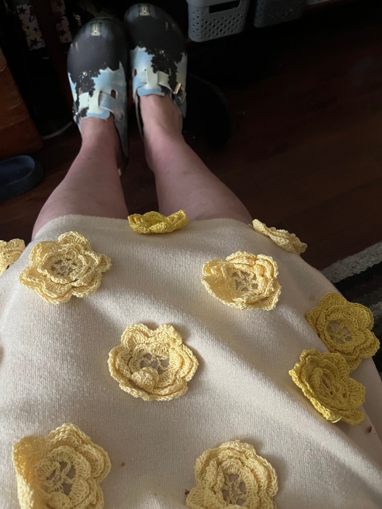 I’m pretty pleased with the way the concept turned out but I wish a had more of crocheted flower (there are only three left over) so I could have decorated the whole skirt. I can always look up how to make more petals.