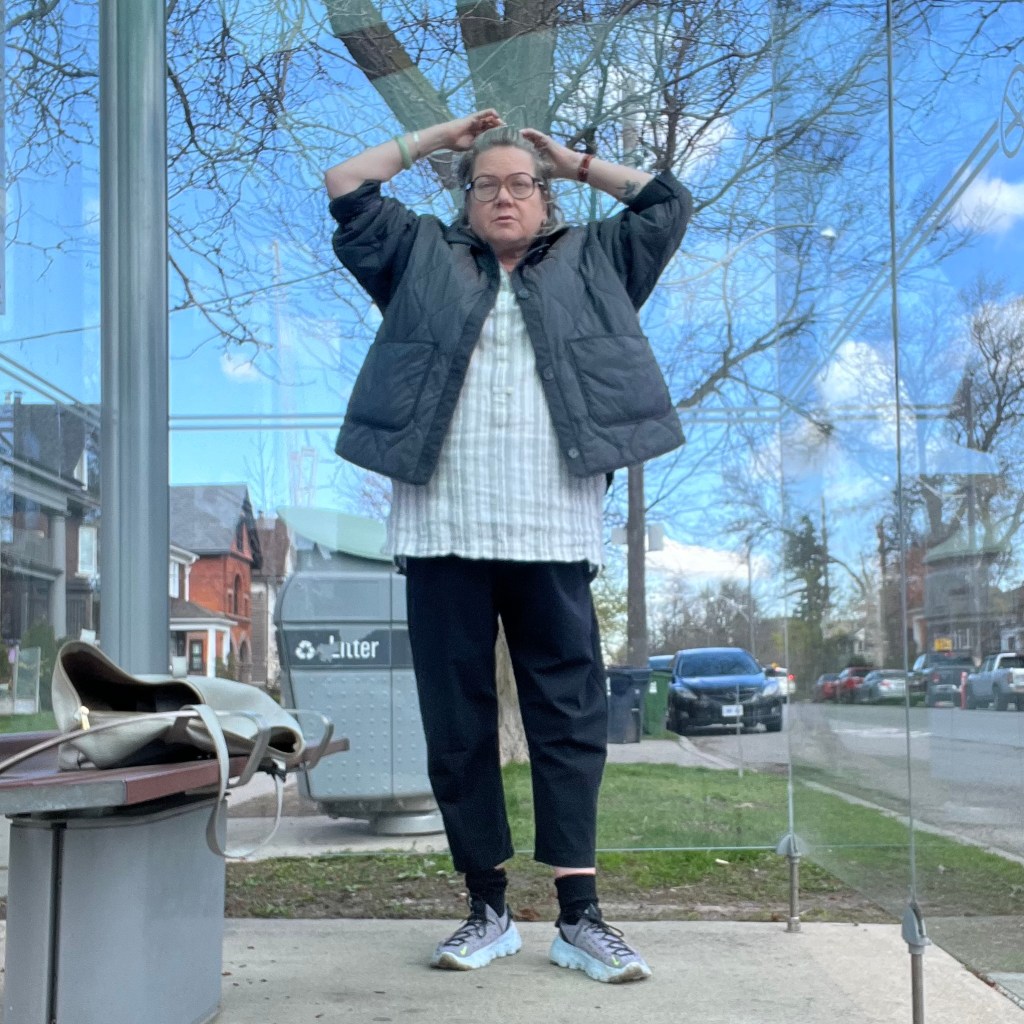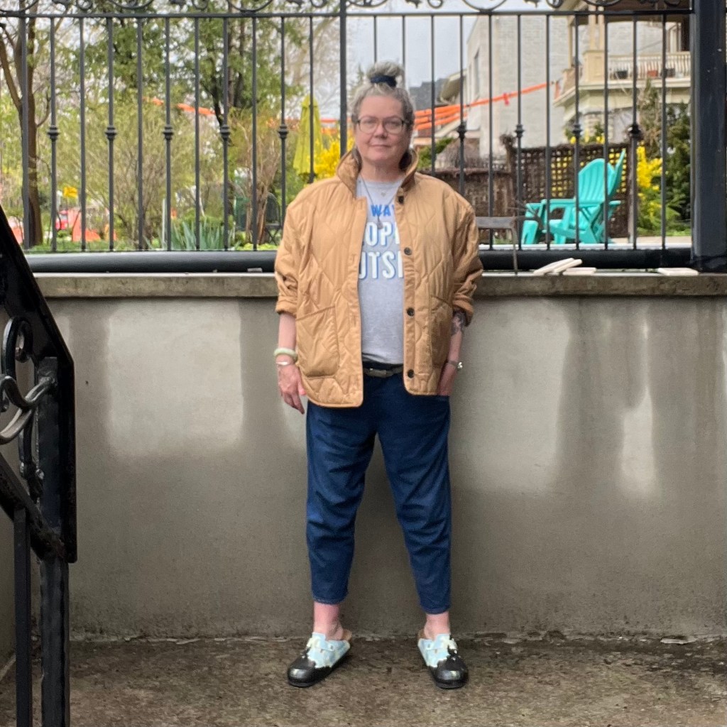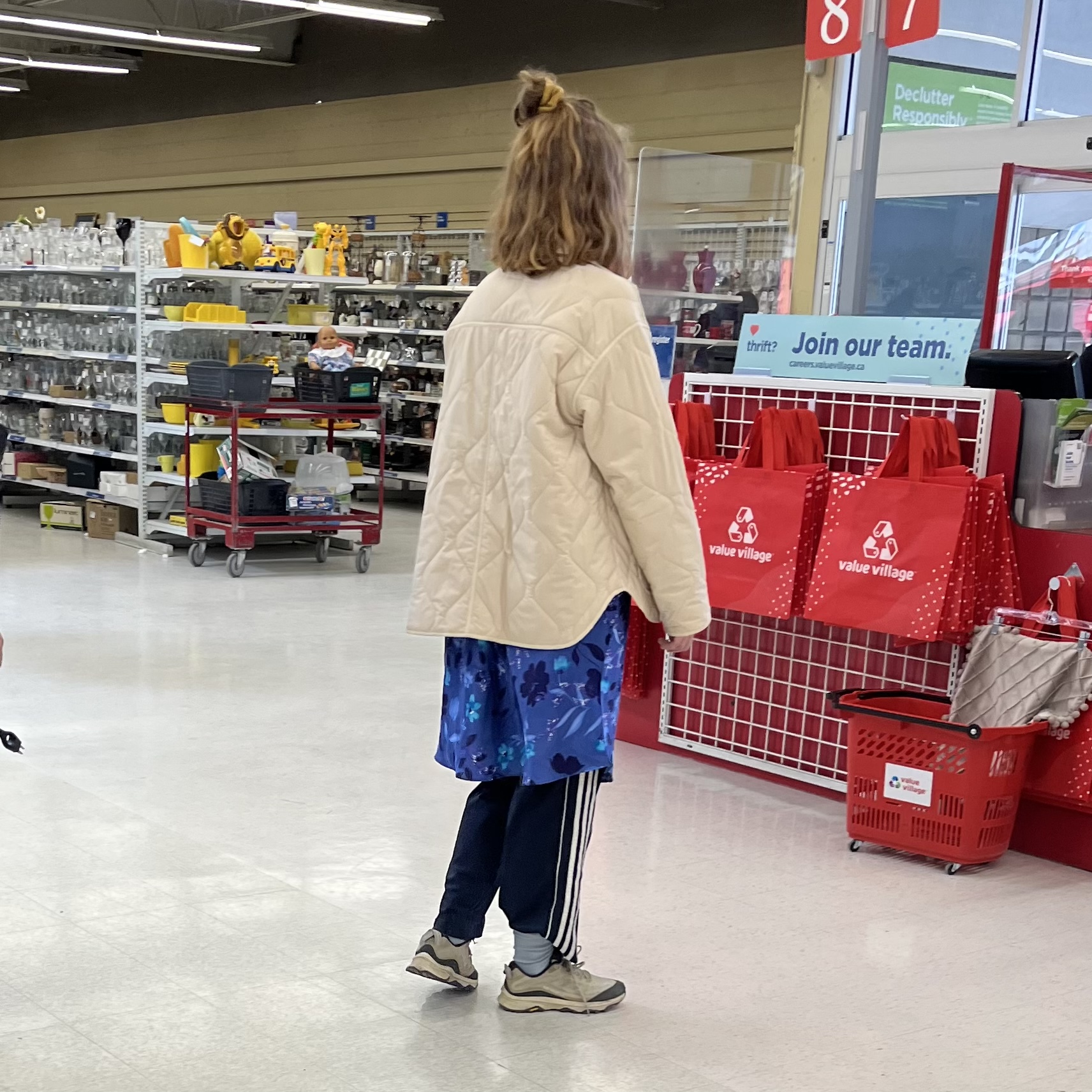 I saw this person at the Value Village and fell in love with the ensemble. This picture doesn’t come close to capturing the loveliness of the layering but trust me, it was next level. So I set about scouring the store for pieces that would approximate this look.