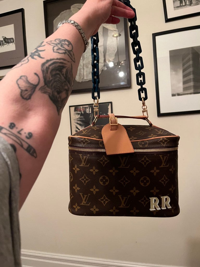 Mostly I got art and jewelry making supplies. But I also bought this plastic link chain purse strap. I’ve been thinking of ways to convert my Louis Vuitton BB toiletries bag into a purse for a while now. Ideally I would like to purchase a long, beaded cross body strap, but I thought I’d try it out with this teal handle. The larger problem is how the bag opens. It might be good for travelling and one needs to be able to access larger things like medicine, travel documents, and electronics without having to fish around in a tote bag. But maybe it’s not so great for when you just want something flat.