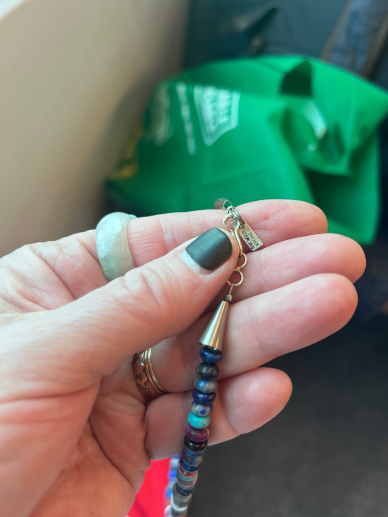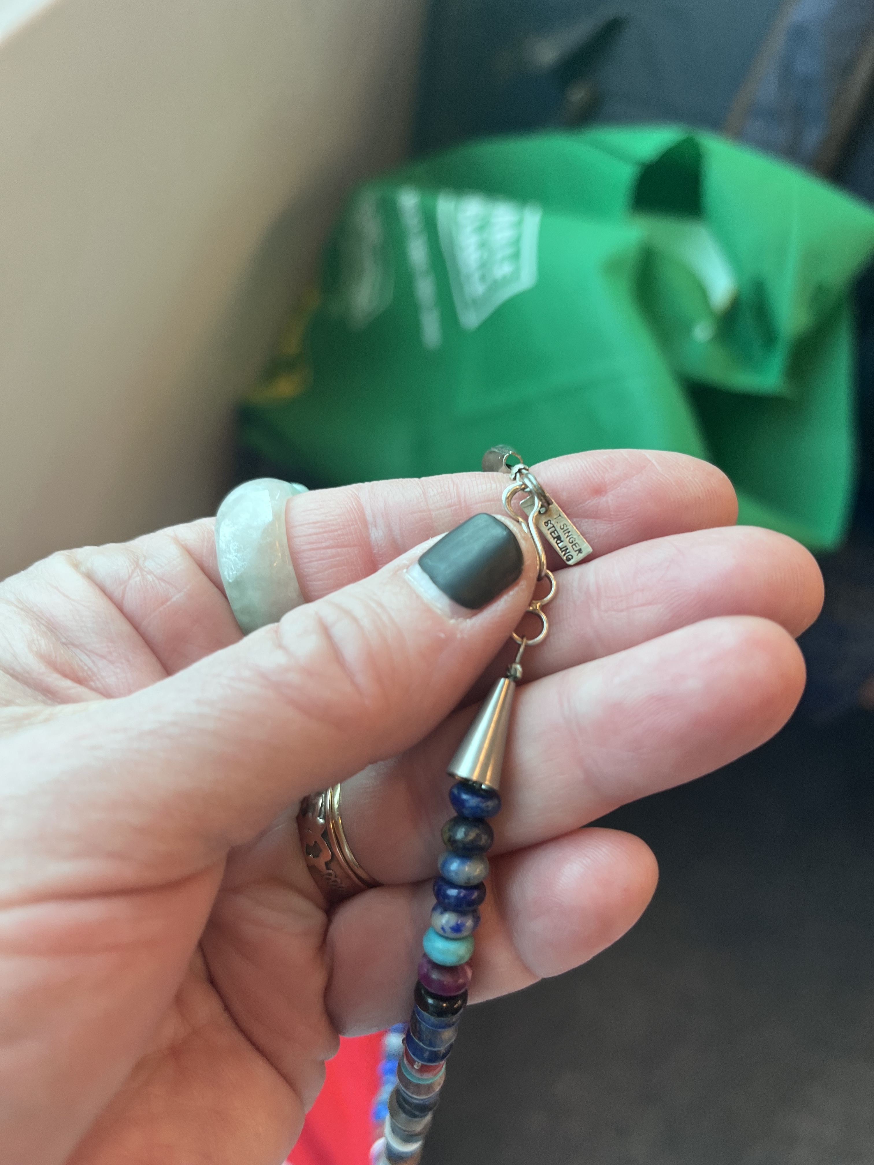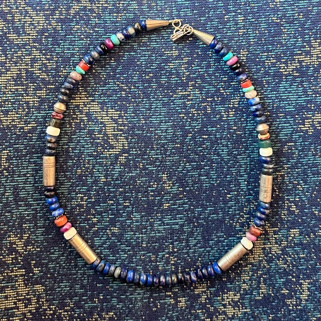 I’m curious so I went through the box and one necklace stood out. It wasn’t broken and it the beads were made of semi-precious stones and silver. The piece was signed T. Singer. A little light googling revealed that the piece was made by Tommy Singer, a prominent Navajo silversmith who pretty much invented the “chip inlay” technique in the 1970s,