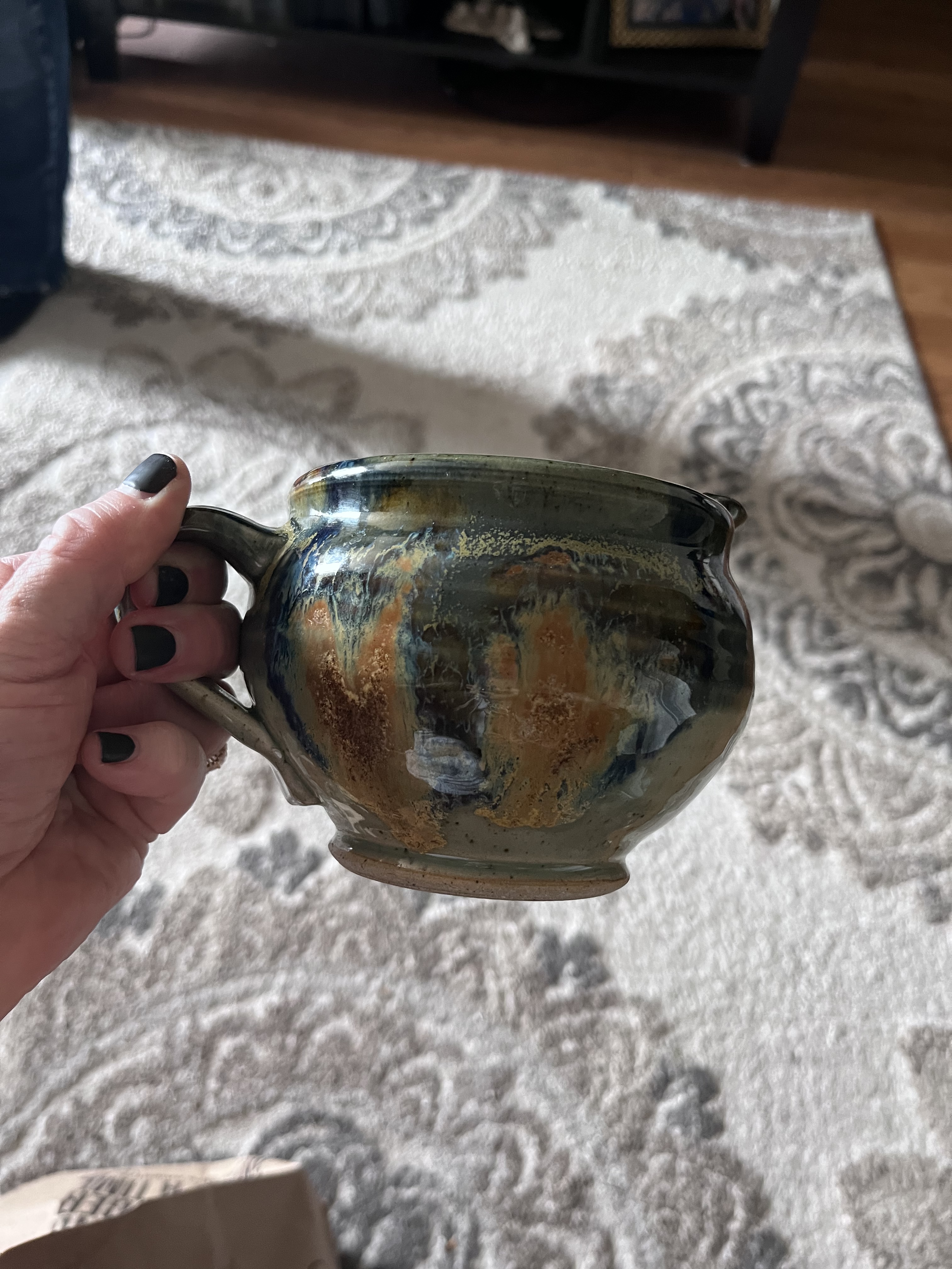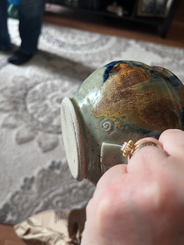 On the weekend, I went on a long amble with my mom and we passed a yard sale. It was mostly stuffed animals and other kid stuff, but we spotted this gorgeous piece of studio pottery. My mom recognized the artist as someone whose work she’d seen at the Canadian Clay and Glass museum. The seller confirmed it was by Barbara Murphy. And then she gave it to us for free. My mother won the custody battle but I made her promise she’d leave it to me in her will.