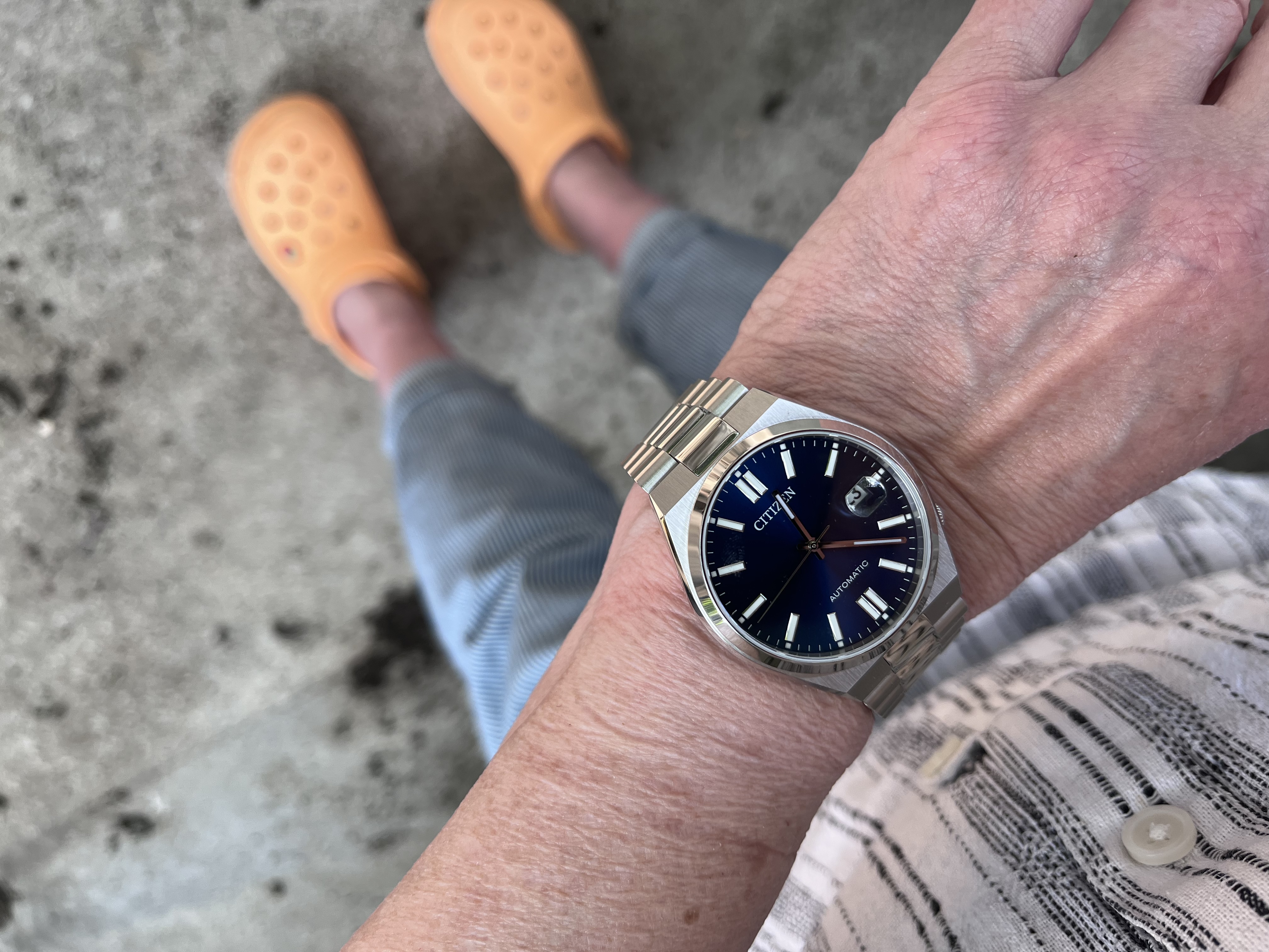 I’ve been immersed in the watch world. In fact I just got back from Switzerland where I visited the Longines museum and archives which is why I’m behind on blogging. Before I left I came into a treasure trove of timepieces. And there was a watch waiting for me when I got back. So let’s do a quick inventory, starting with the new Citizen Automatic NJ015 aka the “Tsuyosa” (meaning “strength” in Japanese). Citizen sent this watch to test drive. There are five different dial colours– blue, yellow, green, aqua and black – each with a fun Sunray finish (I am trying out blue and I have failed to capture the play of light in this picture). First impressions: I love the contrast of the brushed and polished surfaces and the offset crown. Disclosure, Citizen Canada also sent a delicious cookie by Lindsey Gazel and some cool Leuchtturm1917 stationery along with the sample watch so they clearly have my number.