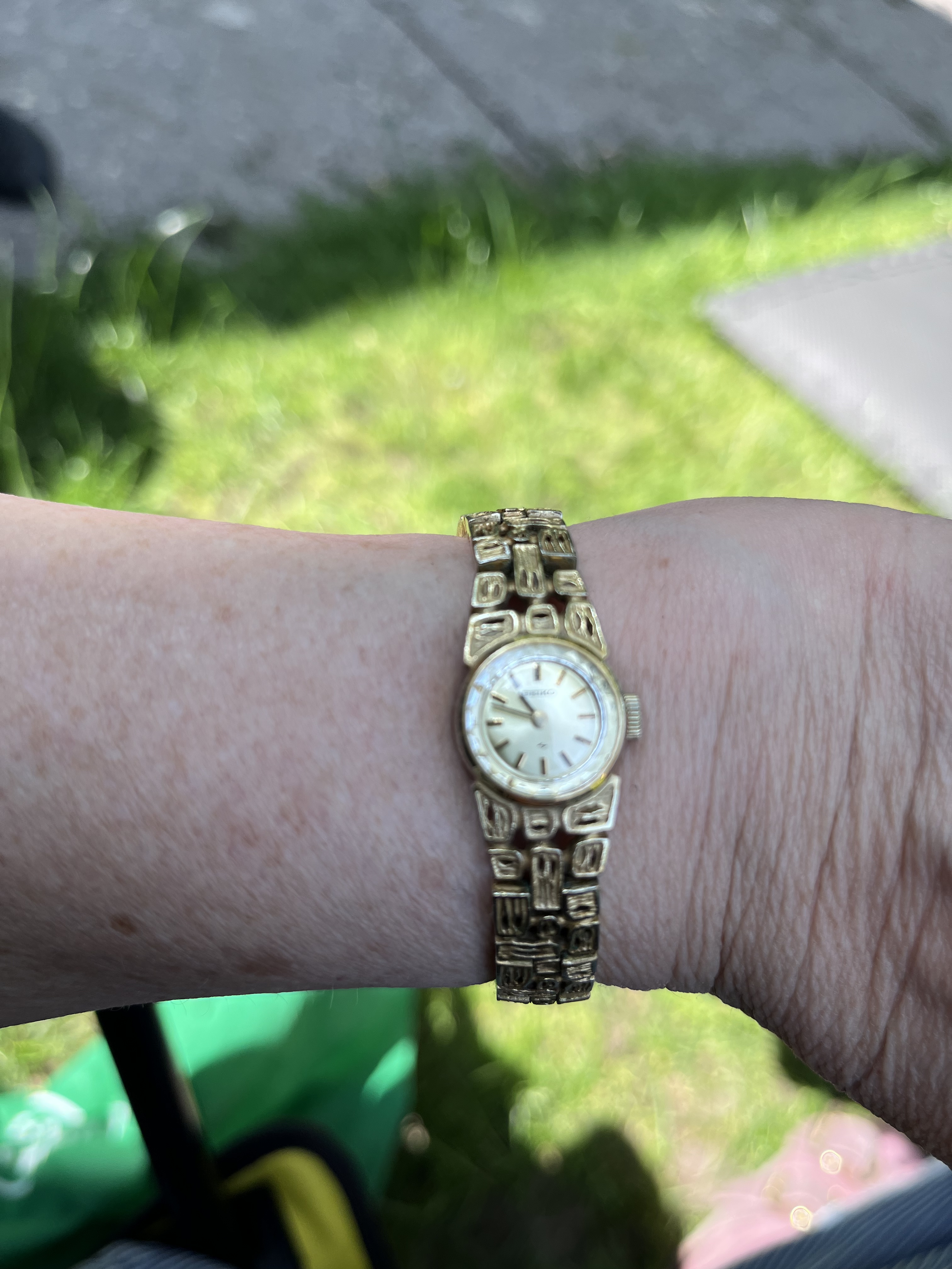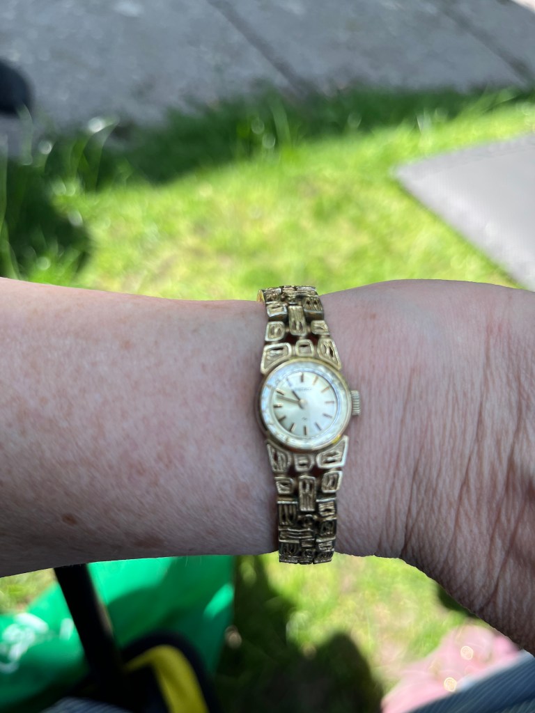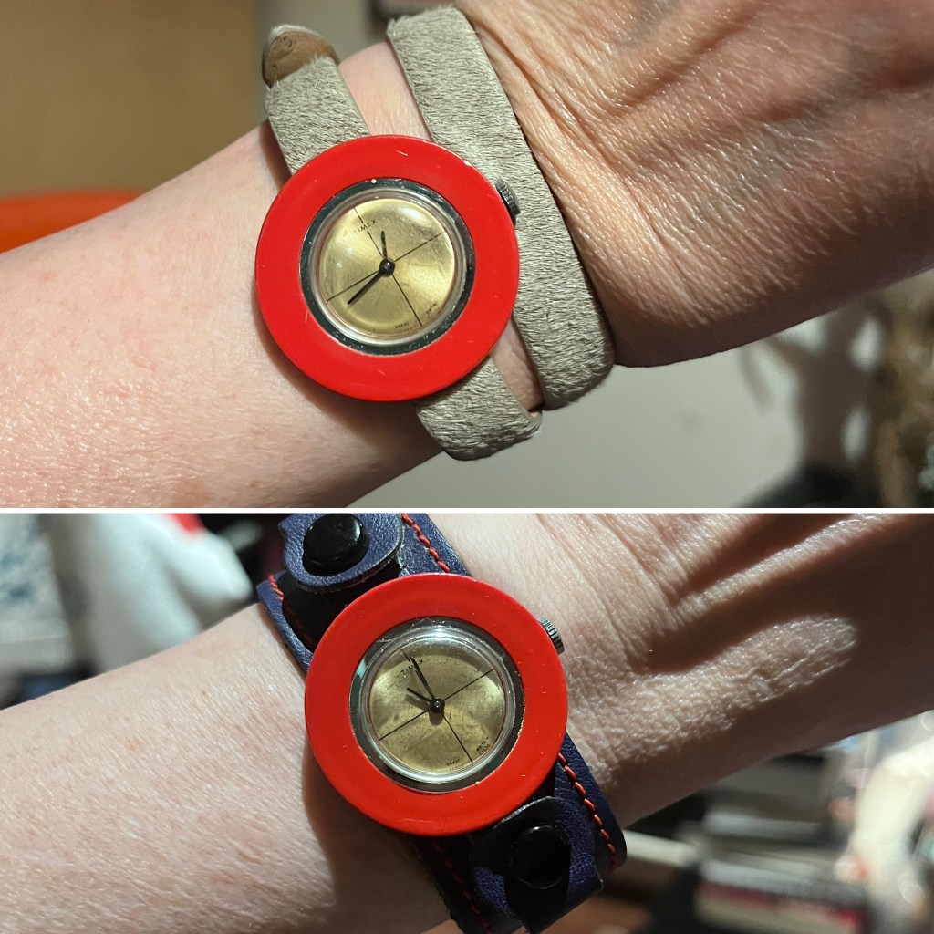 Next, I traded some timepieces with my friend Sarah (who has an excellent eye for thrift shop finds). First up is this mod Timex Cavatina. I had this on my Pinterest forever — it was Timex’s answer to the Rolex Chameleons and other interchangeable watches of the 1960s.