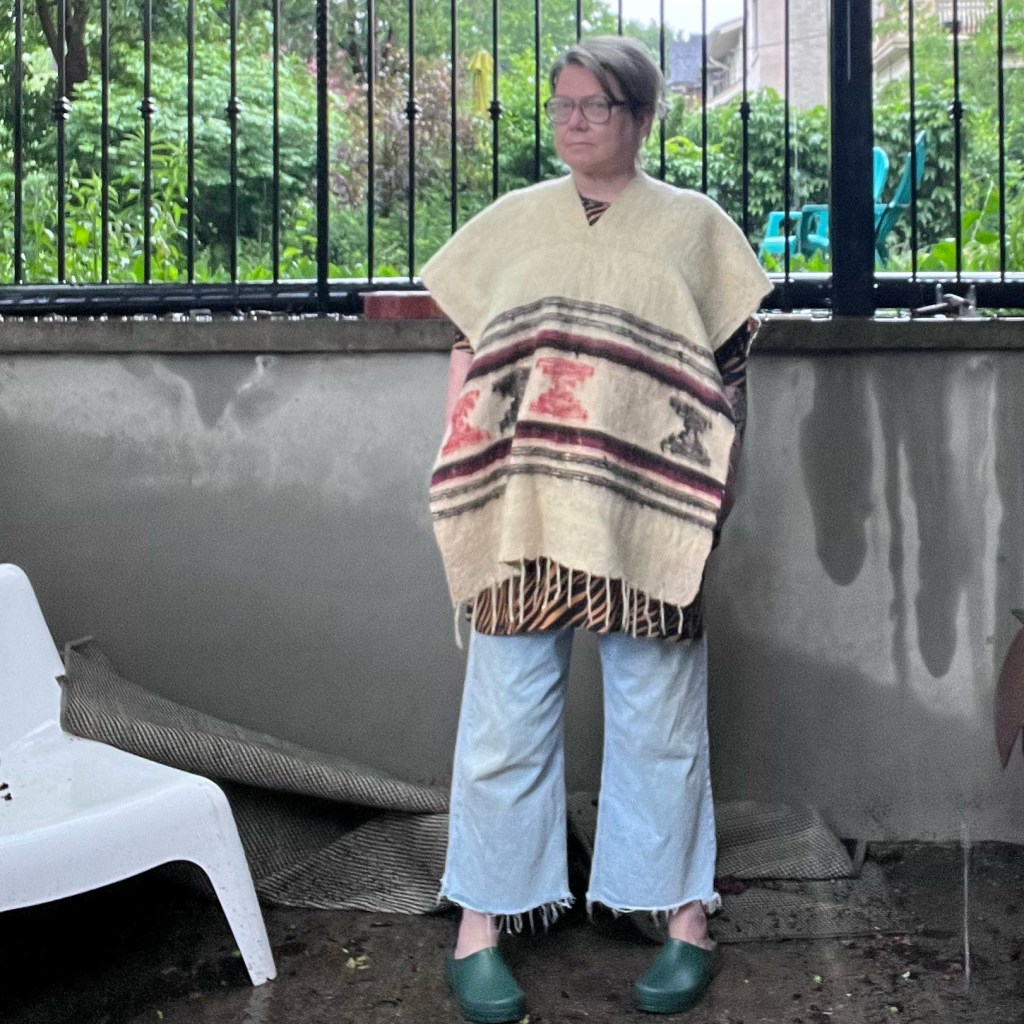 It’s been a busy couple of weeks. Lots of trips (Switzerland! Kitchener! Brockville!) and a little bit of shopping. Pictured above is a vintage poncho I picked up at our neighbours garage sale. I bought it because we were having our own yard sale and I needed something that would protect me from the sun’s harmful rays. As opposed to, you know, going into my own home and getting a poncho or any other garment that I already own.