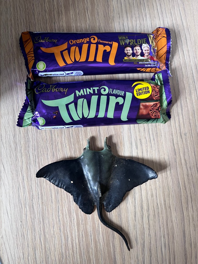I also found a little plastic Manta Ray on the sidewalk. Skates and rays are my favourite fish (I paid for — and ate — the chocolates).