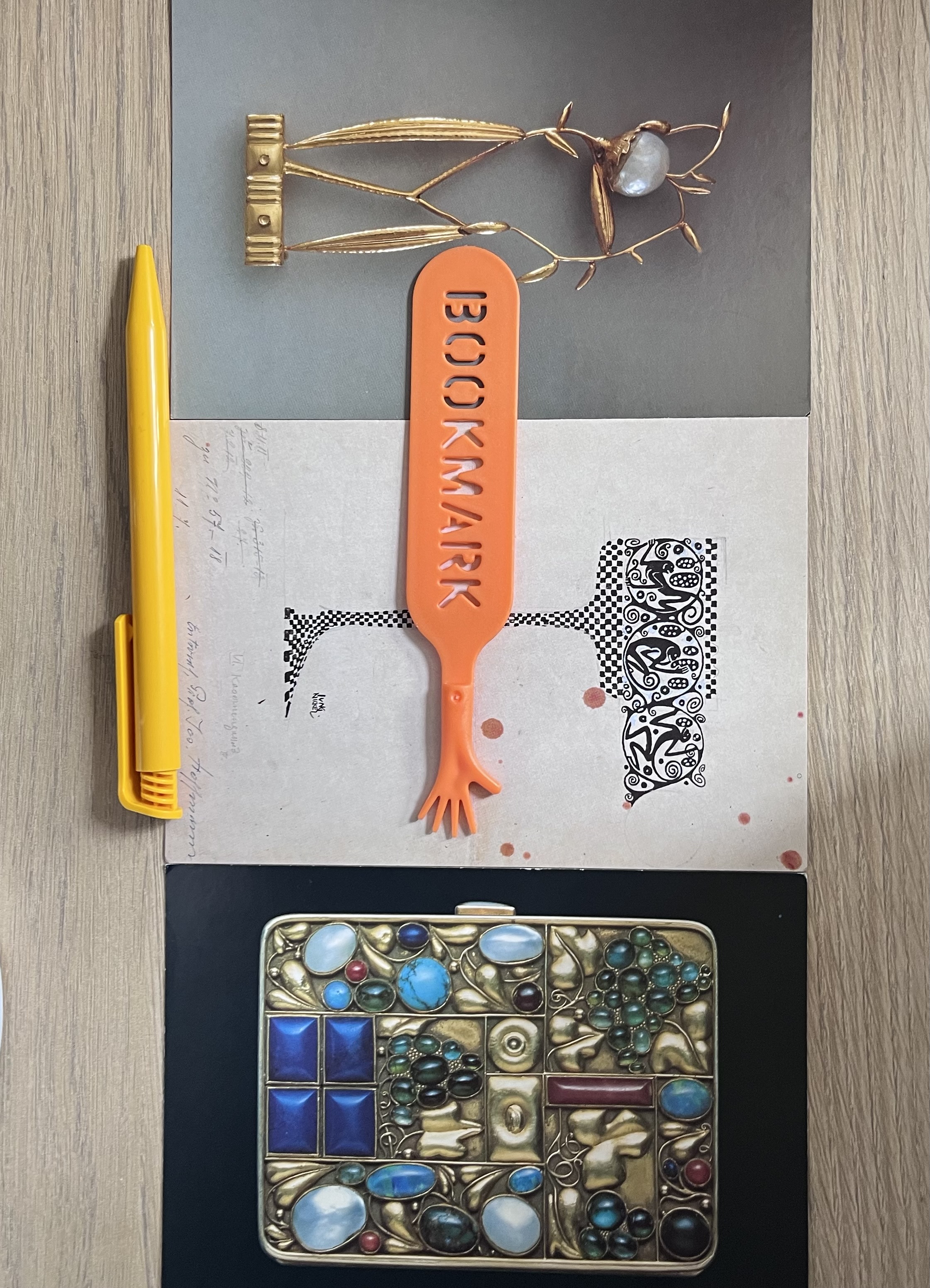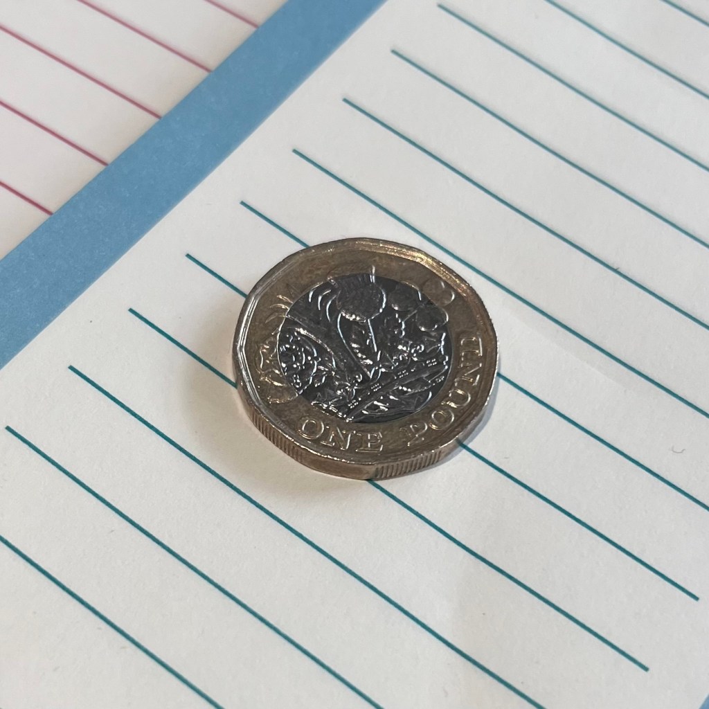 The pen pictured above was a gimme at the post office. The postcards and bookmark (from the Oxfam shop) were 10 pence each but financed by this one pound coin I found on the ground.