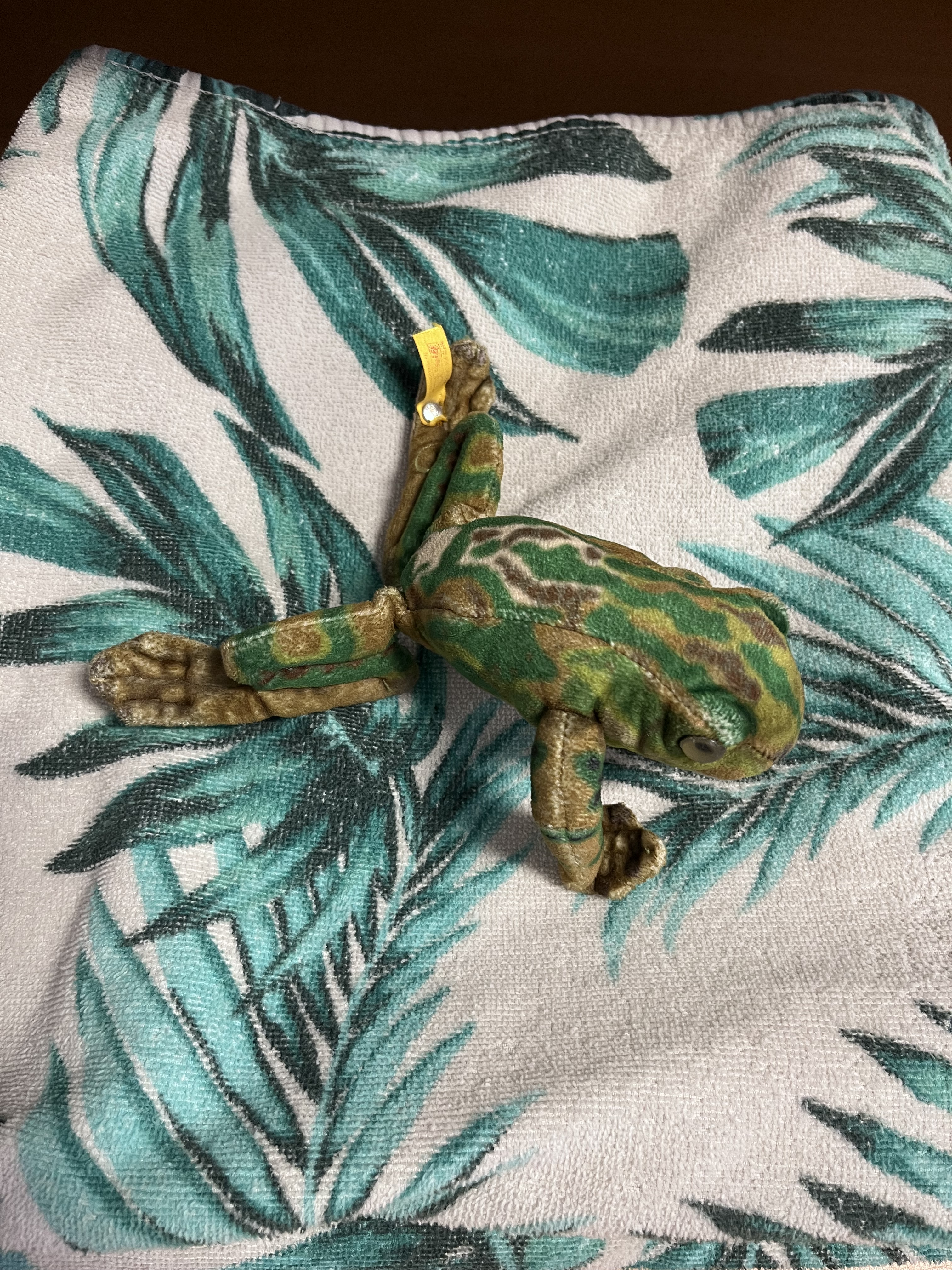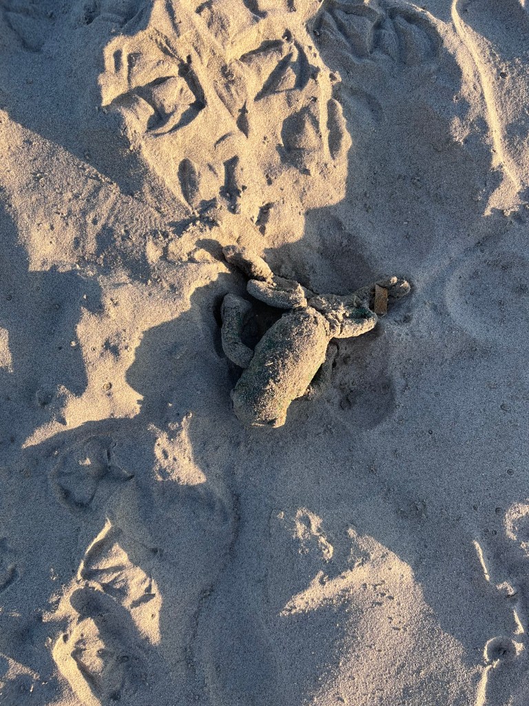 We went to Long Beach to frolic in the Ocean. During our sunset stroll on the sand, I stepped on a little buried plushie. I dug it up and discovered that it was a Steiff x National Geographic toy called Froggy Frog. I put it in my pocket and brought it back to the hotel.