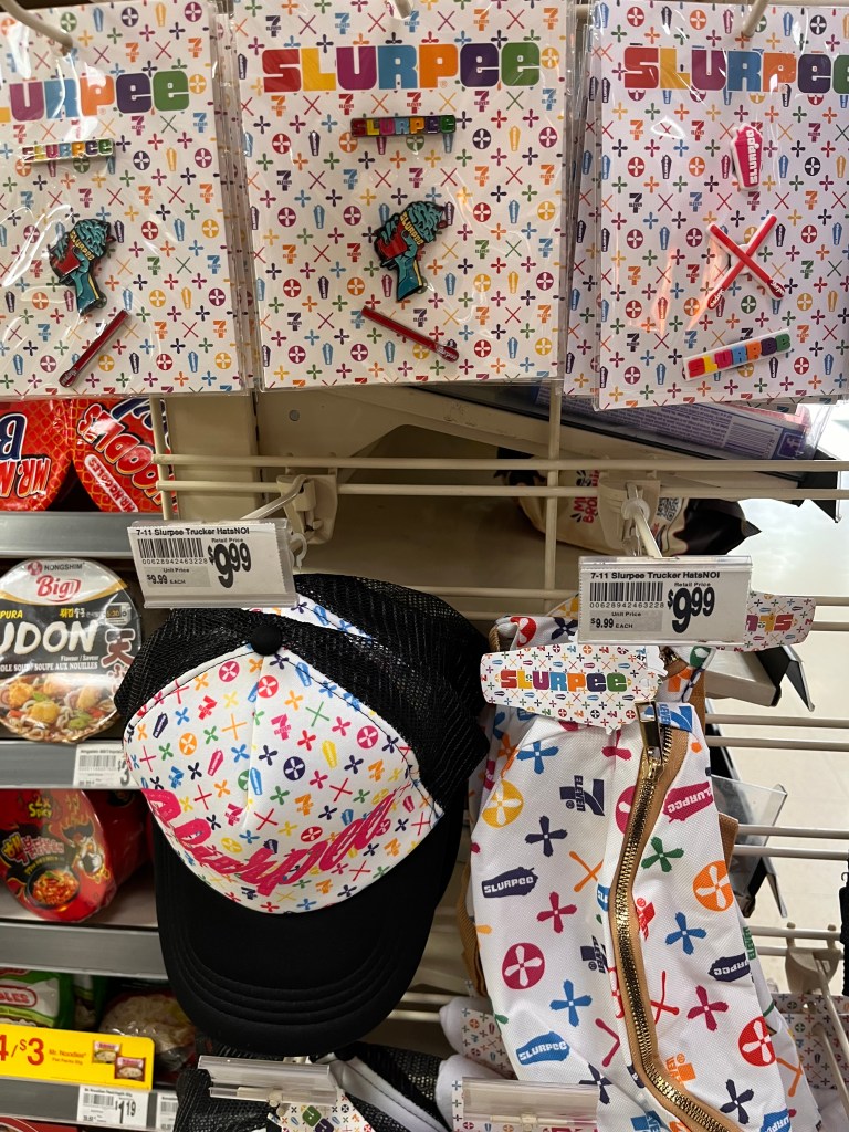 7-11 has really upped their merch game. I bought these branded Slurpee jibbits last week but they had all kinds of swag, much of it with a cheeky spin on the Louis Vuitton logo.