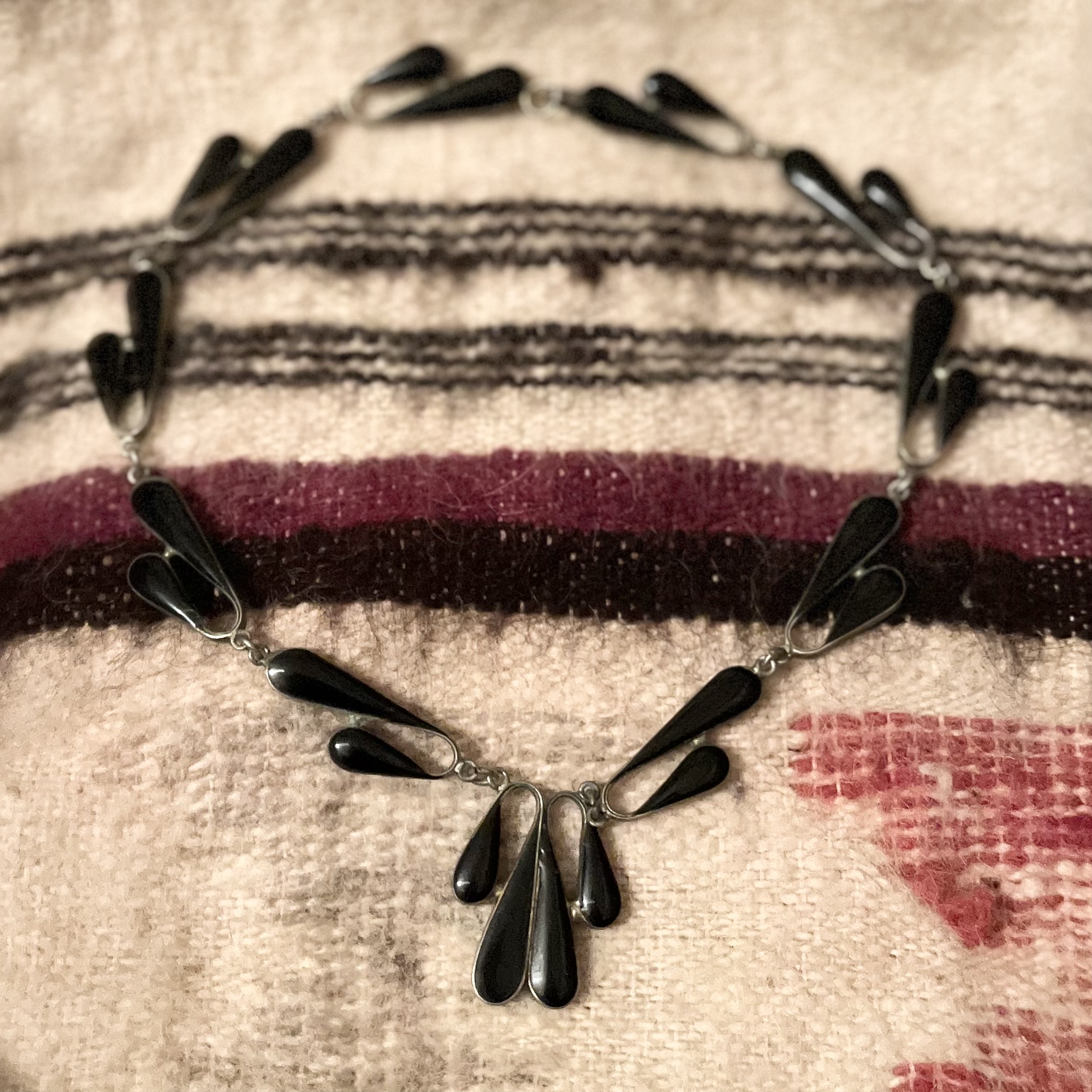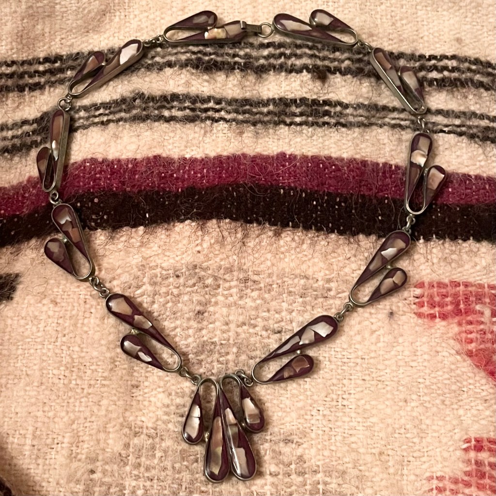When writing yesterday’s post about recent Mexican jewelry finds, I forgot to include this reversible alpaca (nickel silver) necklace. It’s shell encased in clear resin on one side, black resin on the other. I found it at the Value Village a couple of months ago. I can’t believe I overlooked this beauty!