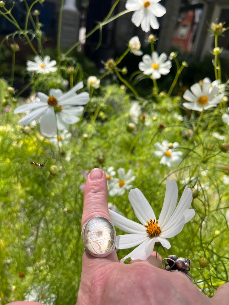As you know, I enjoy a good yard sale. Here are some recently got goodies from the last couple of weekends. The most major acquisitions came from a sale across the street. I purchased two sterling studio rings — one a titillated quartz, the other an abstracted “Pisces” piece. Look closely to see the little fishies.