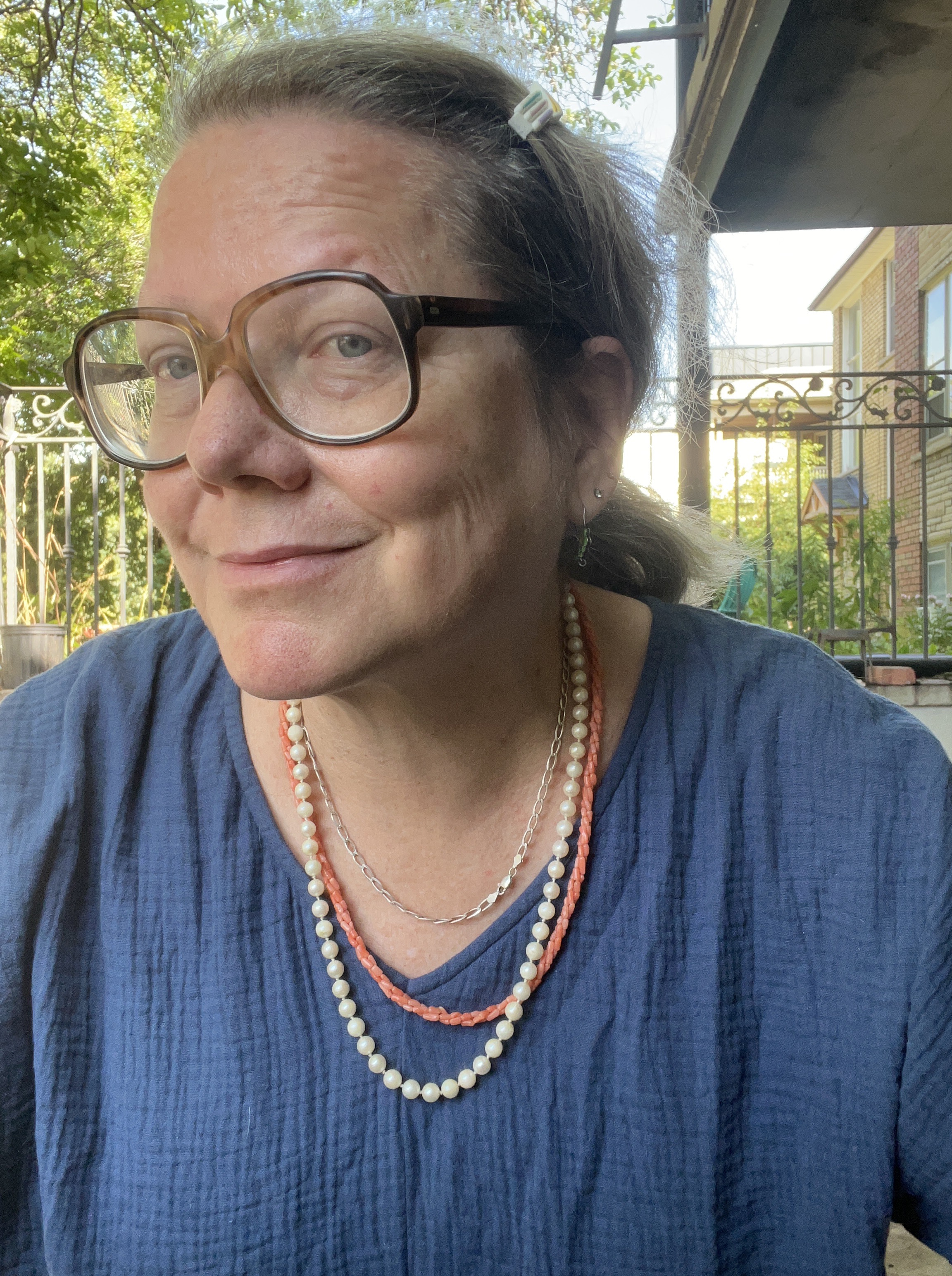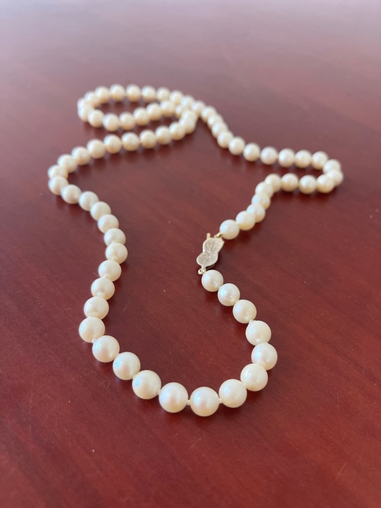 The pearls came from a bag of broken jewelry. They pass the tooth test, but I can’t tell you if they are cultured or of good quality but I liked the length of them. It’s what they call the “matinee length.” It was the same length as a strand of fake pearls that had belonged to my late neighbour Ilse. That necklace had a gorgeous, atomic era 14k clasp. So in tribute to Ilse, I married her clasp with my pearls.