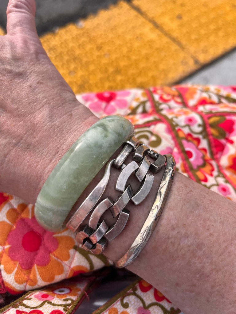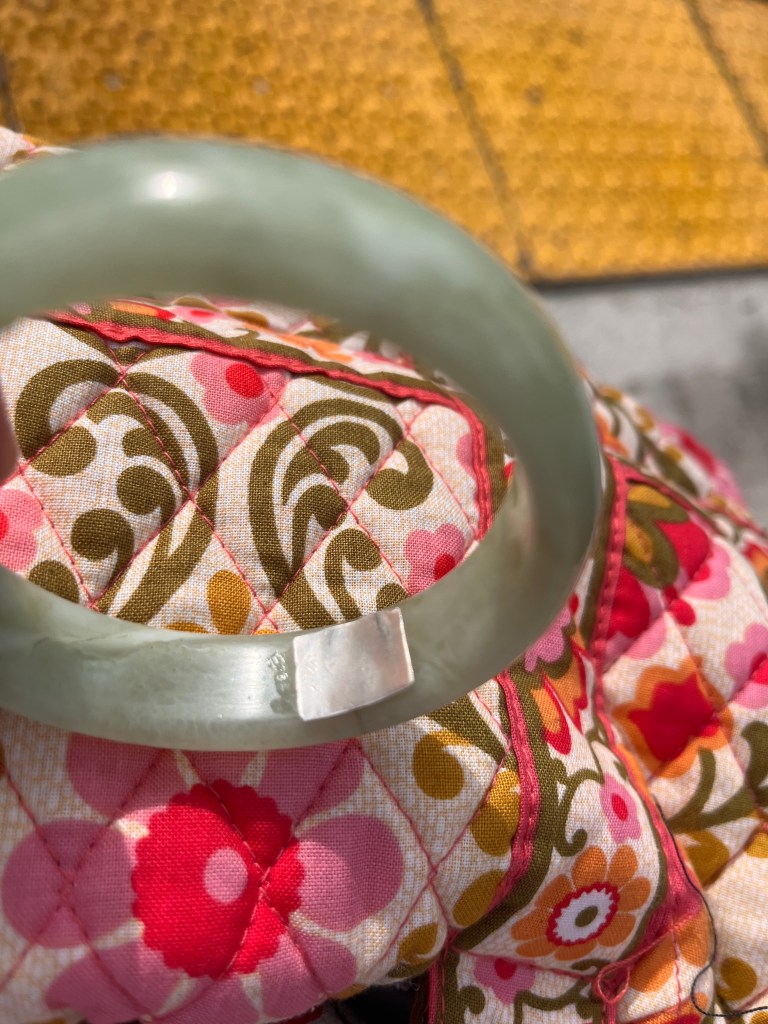 I went on YouTube to try and to fix my beloved but broken jade bangle myself with epoxy. It worked for a while but the bracelet broke again. My friend Jeanie suggested going to a place that sold Jade bangles because they probably deal with this sort of thing all the time. So I went to Dang Jewellers in Parkdale and he put it back together it up using silver patches.