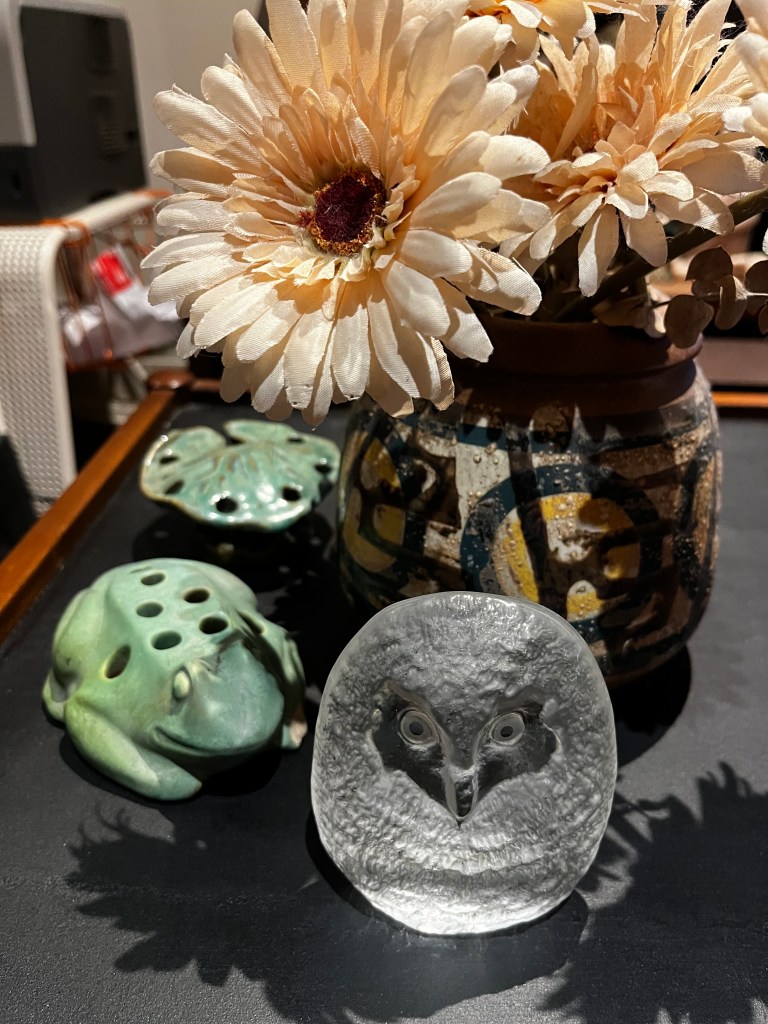 Here’s a tableau of some 1920s Fulper flower frogs and a mid century modern glass owl by Swedish artist Mats Jonasson. I got the lily pad and Froggo at an indoor garage sale at the church across the street. They had belonged to the woman who was organizing the sale’s late mother in law. I can’t believe I have a frog-shaped flower frog! And the owl I found thrifting with my friend Sarah.