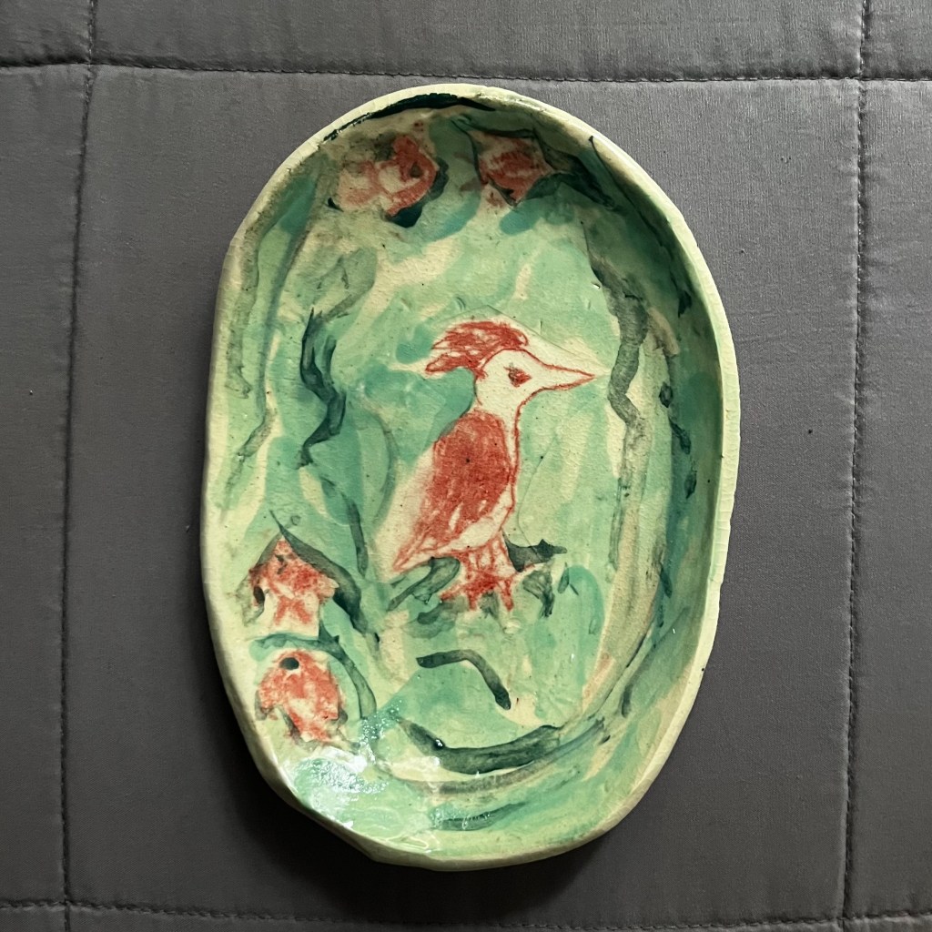 I when I was in New York a couple of weeks ago, I stayed at the West Side YMCA. They hear having a pottery sale in the lobby. I bought this little birdie plate. It was only $5. I would have bought a million things but I was traveling light.