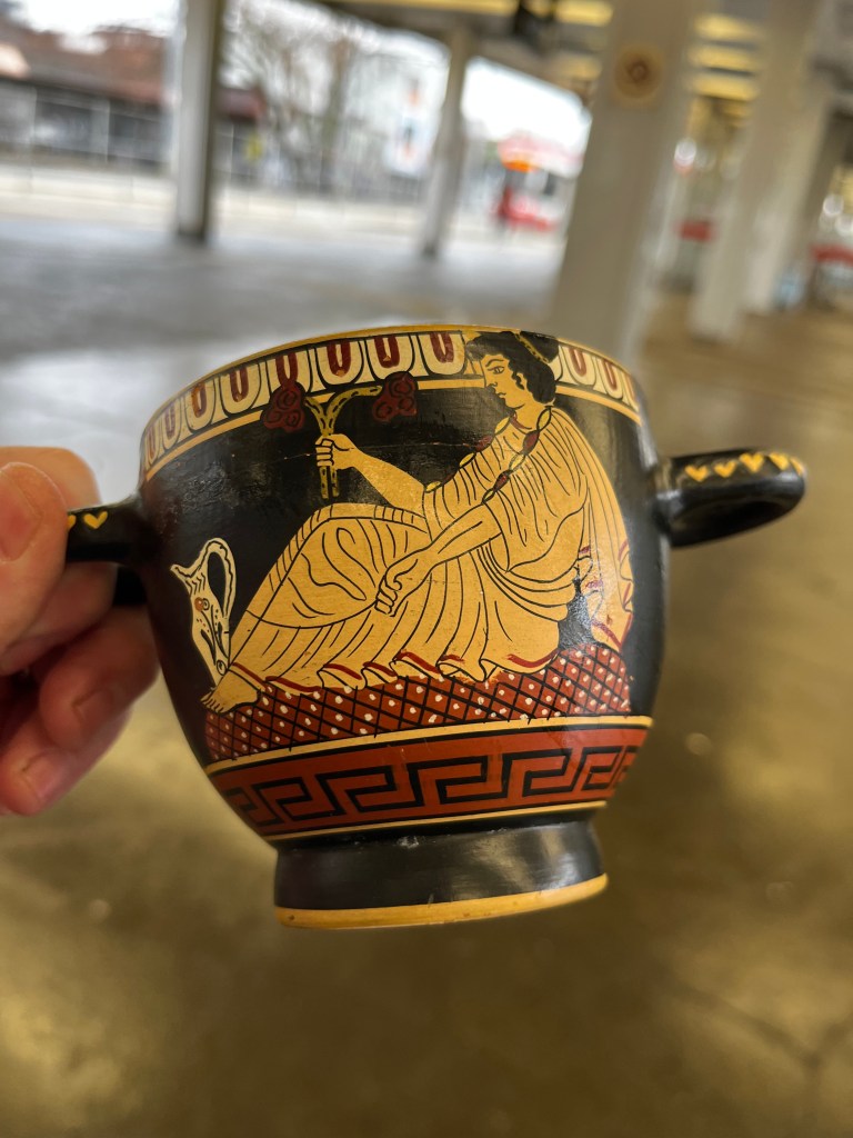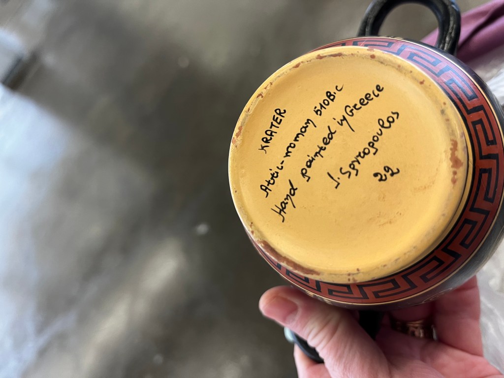 I did a little trade for a bag full of pots and figurines on Facebook Marketplace. I haven’t had a chance to do a deep dive into the pieces but these two are the most interesting. Pictured above is a hand painted pot signed J. Spyropoulos. I googled the name in search of similar pieces and found that there was a Janis Spyropoulos who was actively making reproductions of museum pieces in the 1960s.