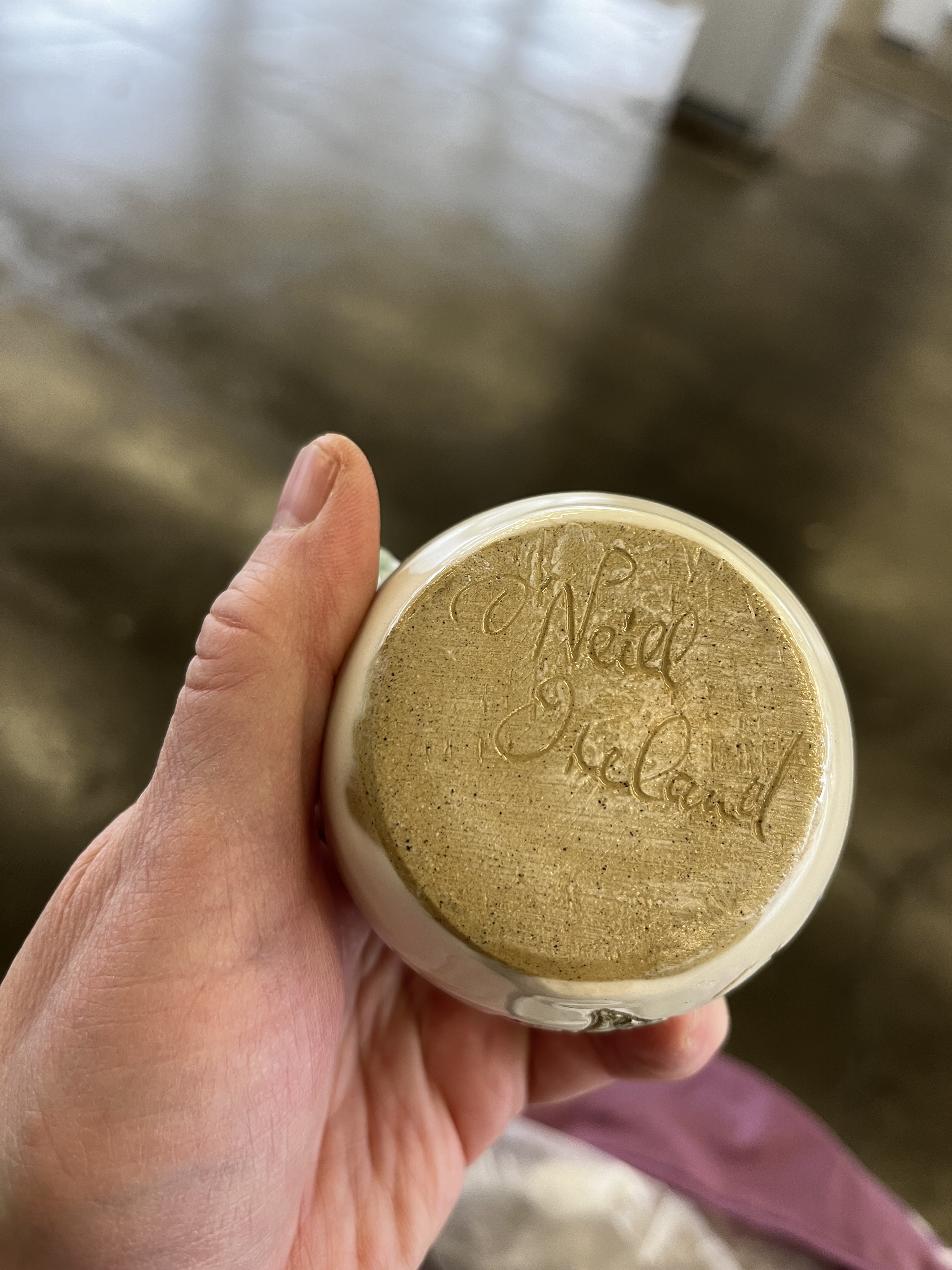 This wee weed pot was made by Rob O’Neill Bunratty Ireland Pottery. It looks like it dates to the 1980s. This studio was situated in Bunratty Folk Park — a collection of houses and shops meant to recreate typical 19th century Irish village life. Stylistically, this bud vase is not representative of any designs of the 1800s. The whole idea of a weed pot — a vase meant to hold a single flower—is more of a mid 20th century modern concept. I have used them in the past to display my feather collection or some dried grasses.