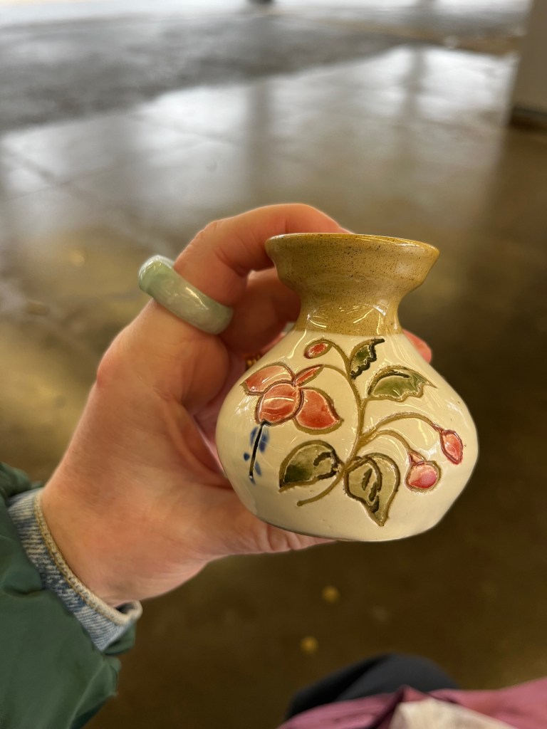 These small ceramics tell nice stories. And they help subsidize artists, but once you get them back home, they are awkward to display (and they require so much dusting). If I didn’t already have so many tchotchkes laying around, I would utilize the pot at a catch all (these pieces are not particularly valuable so I would try and use them) and the vase to display even more feathers.