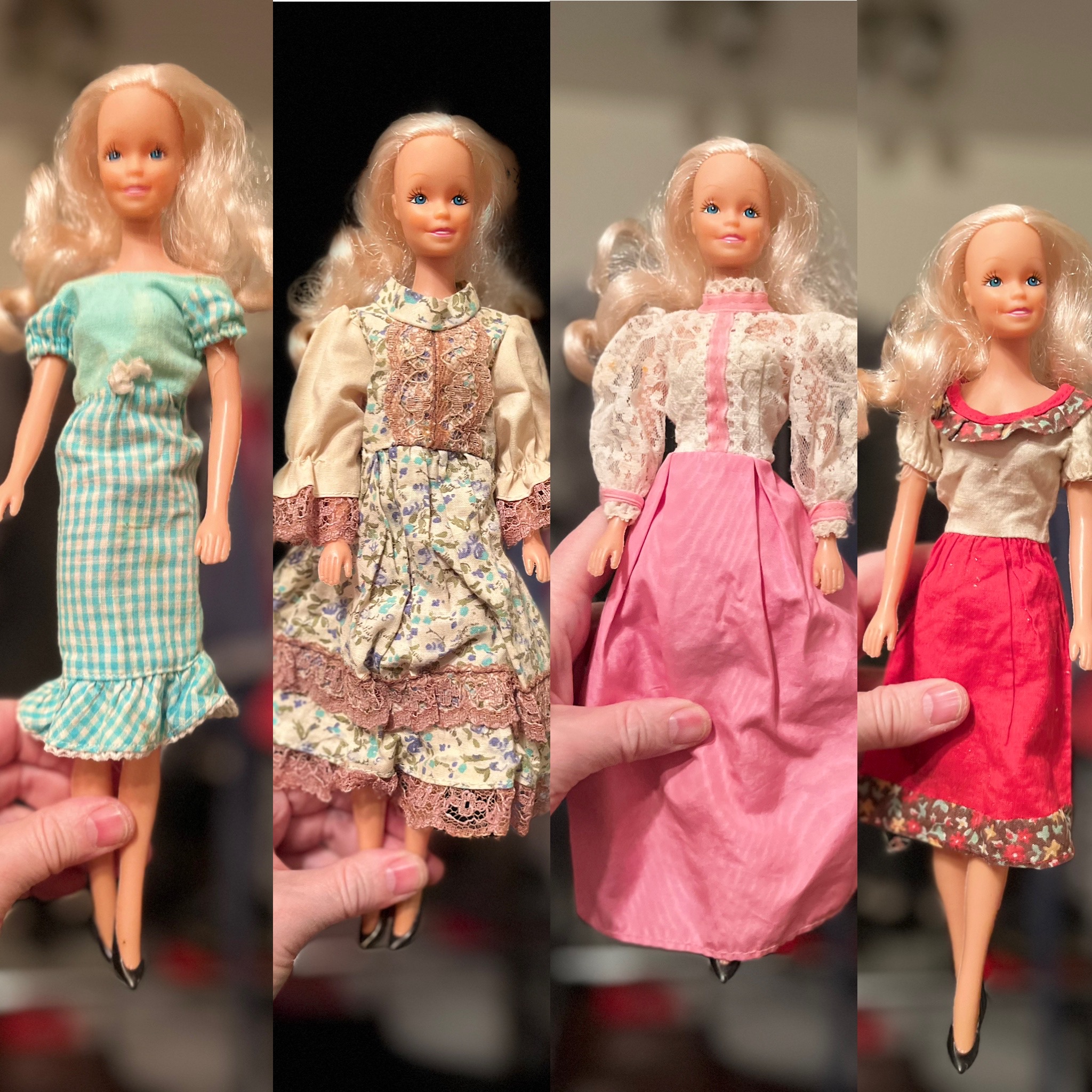 These Prarie-style dresses represent Gunne Sack look of the late 1970s.