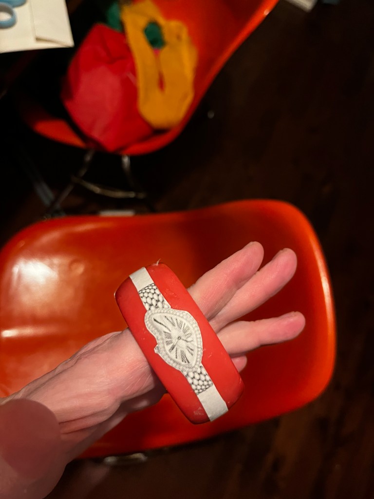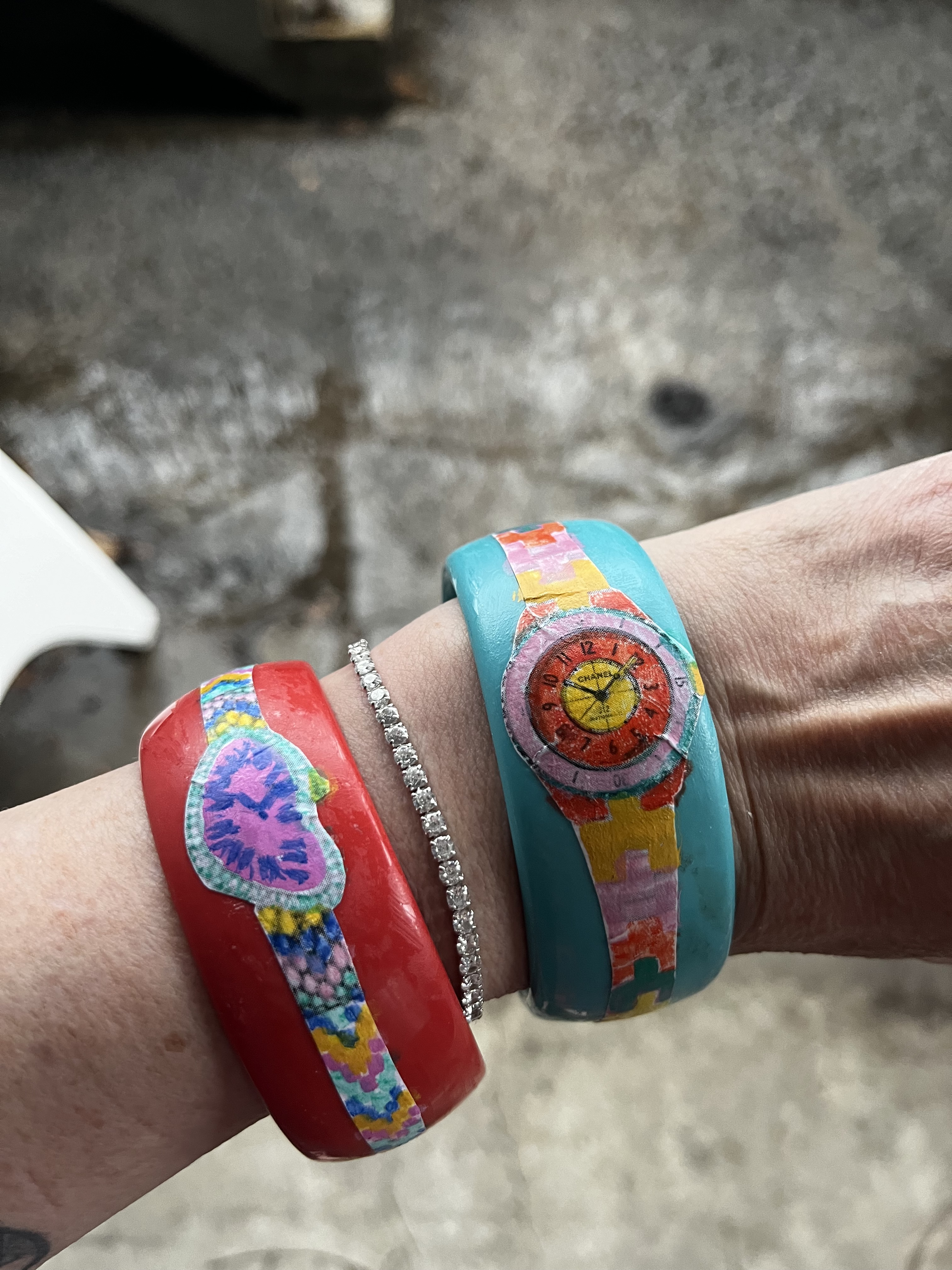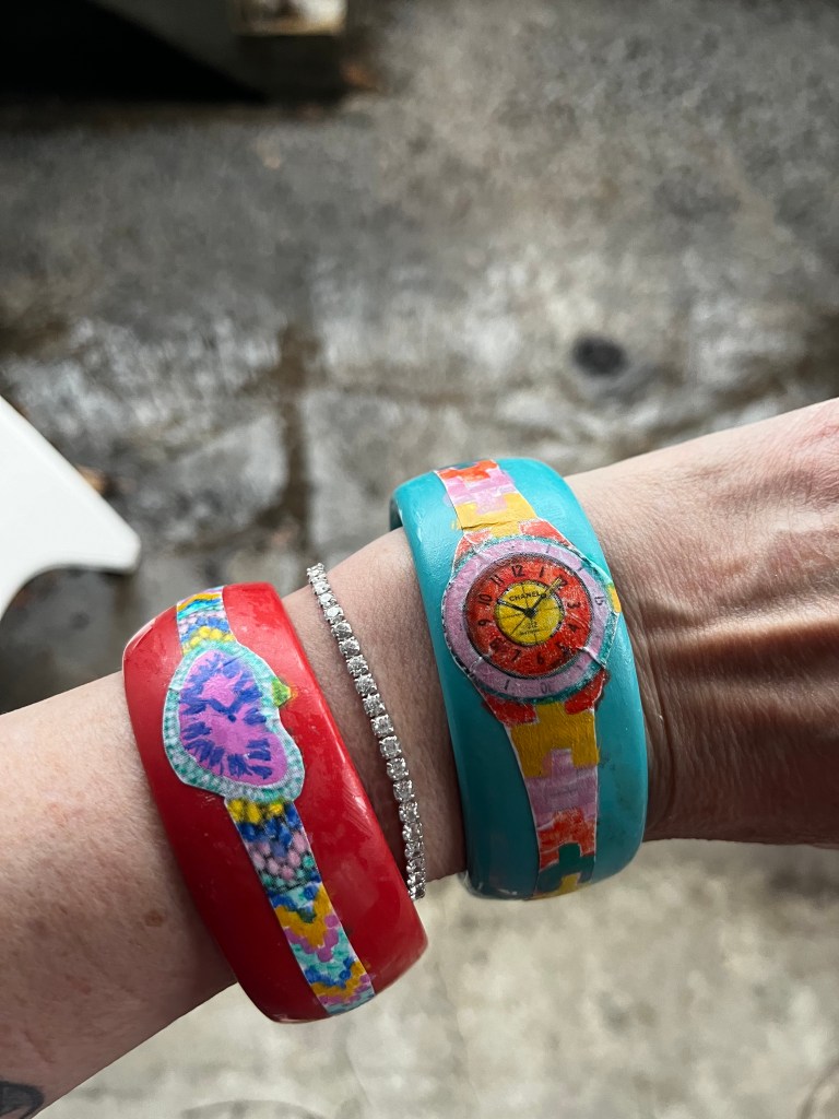 Here they are in their finished form. Still a little crafty-looking. Next time I’ll try drawing them on freehand. And I shall try and find some slimmer spacer bangles to balance out the look.