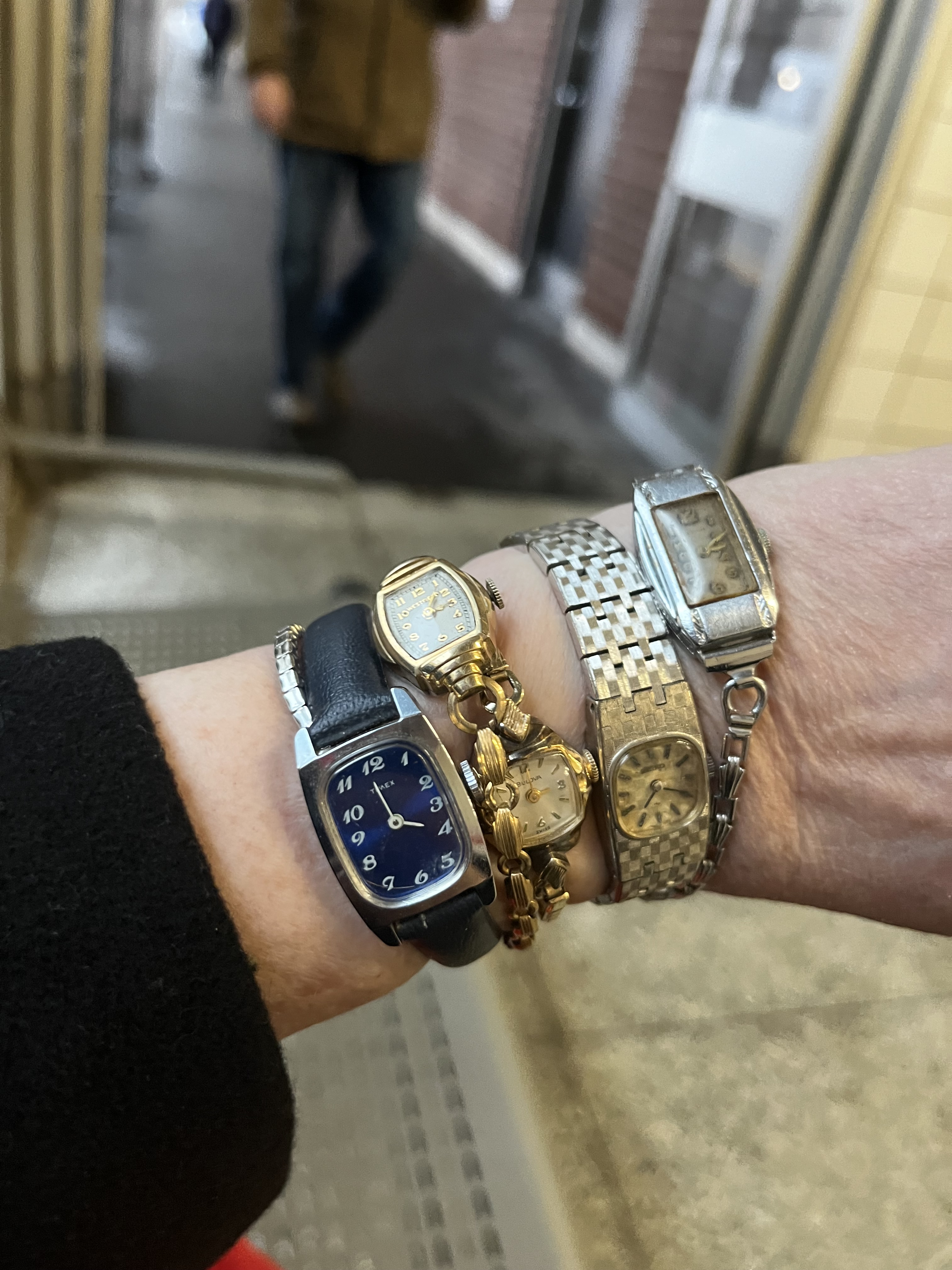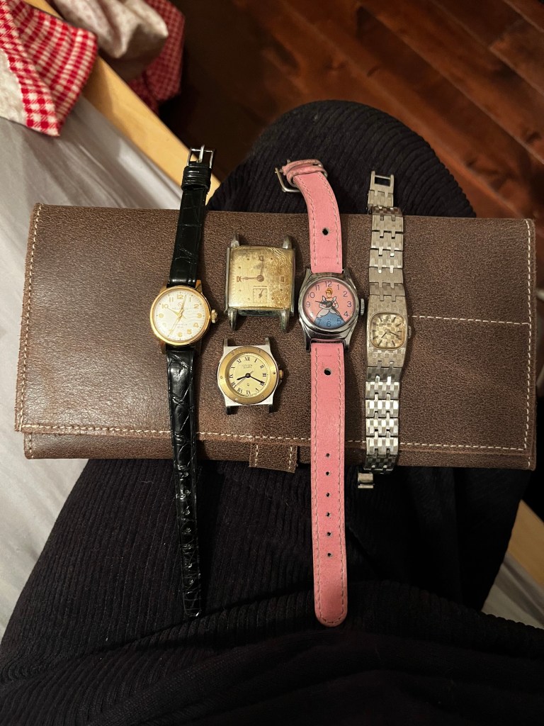 Next up: A stack of ladies mechanical watches. The Timex is not working. The dainty Bulova runs. The Westfield does not. The Seiko works but you can’t set the time. The art deco Glycine was running until I got curious if there were any marks on the inside of the case and ended up losing the hour hand in the process. I will use the hands of the Westfield as donors.
