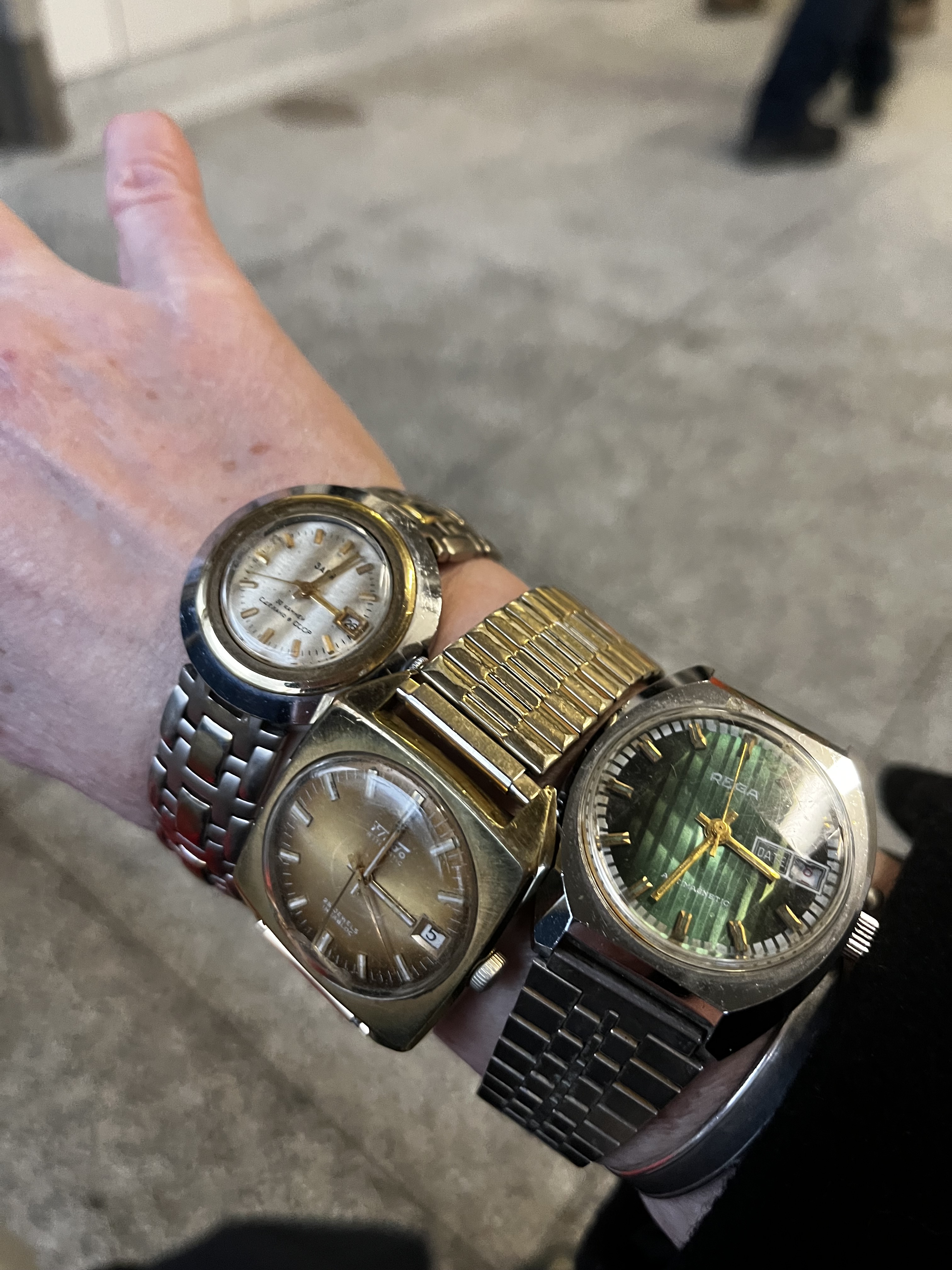 Here are some big chunks of 1970s funk. The Russian UFO is not working. The Fludo in the middle is running but the crystal has issues. The Rega on the right is super extra (a faceted crystal? What?). It ticks but the dial is slightly off centre.