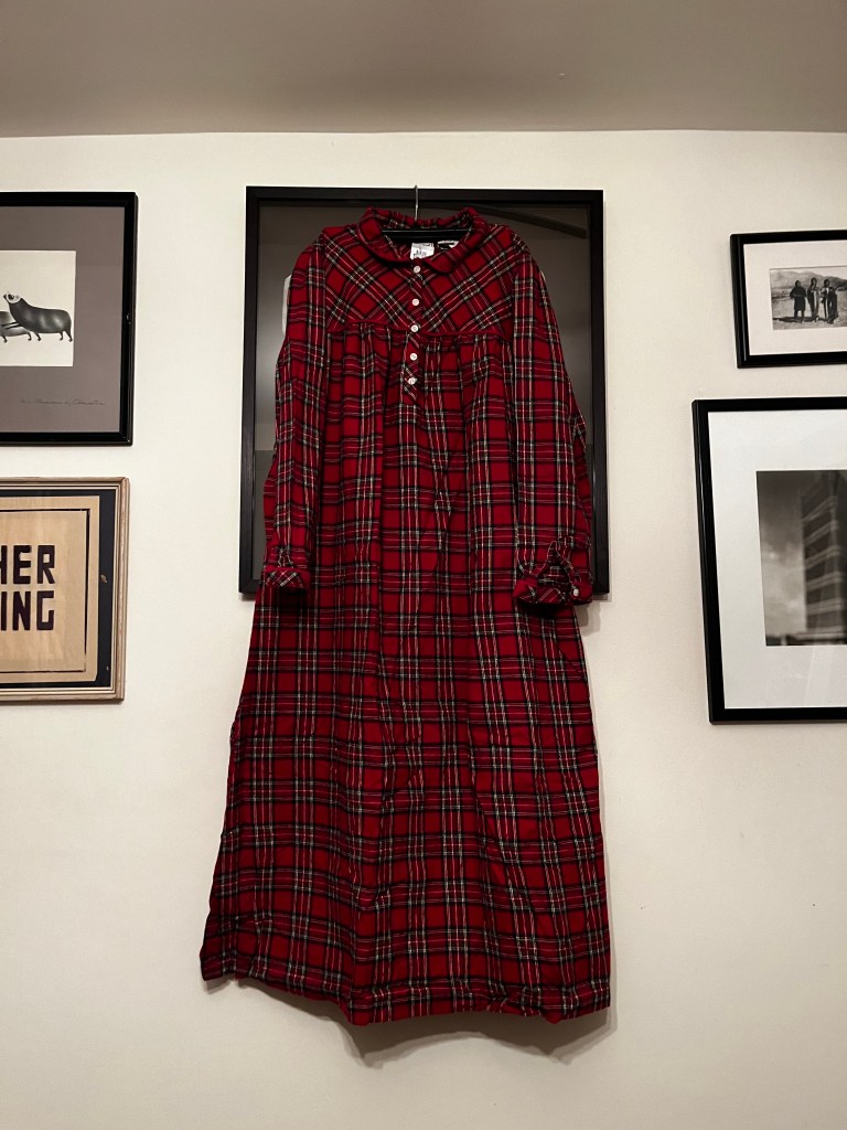 Last week, when the 75 days were up, I went on a thrift shop safari and bought a few things. Some of these gets were from my go list — ie., things that I will buy no matter what. That includes lucite rings (like the sparkler pictured up top), madras (for example the patchwork pants shown above) and L.L. Bean flannel nightgowns (see below). These things don’t present themselves very often, which is why they are on the pre-approved list.