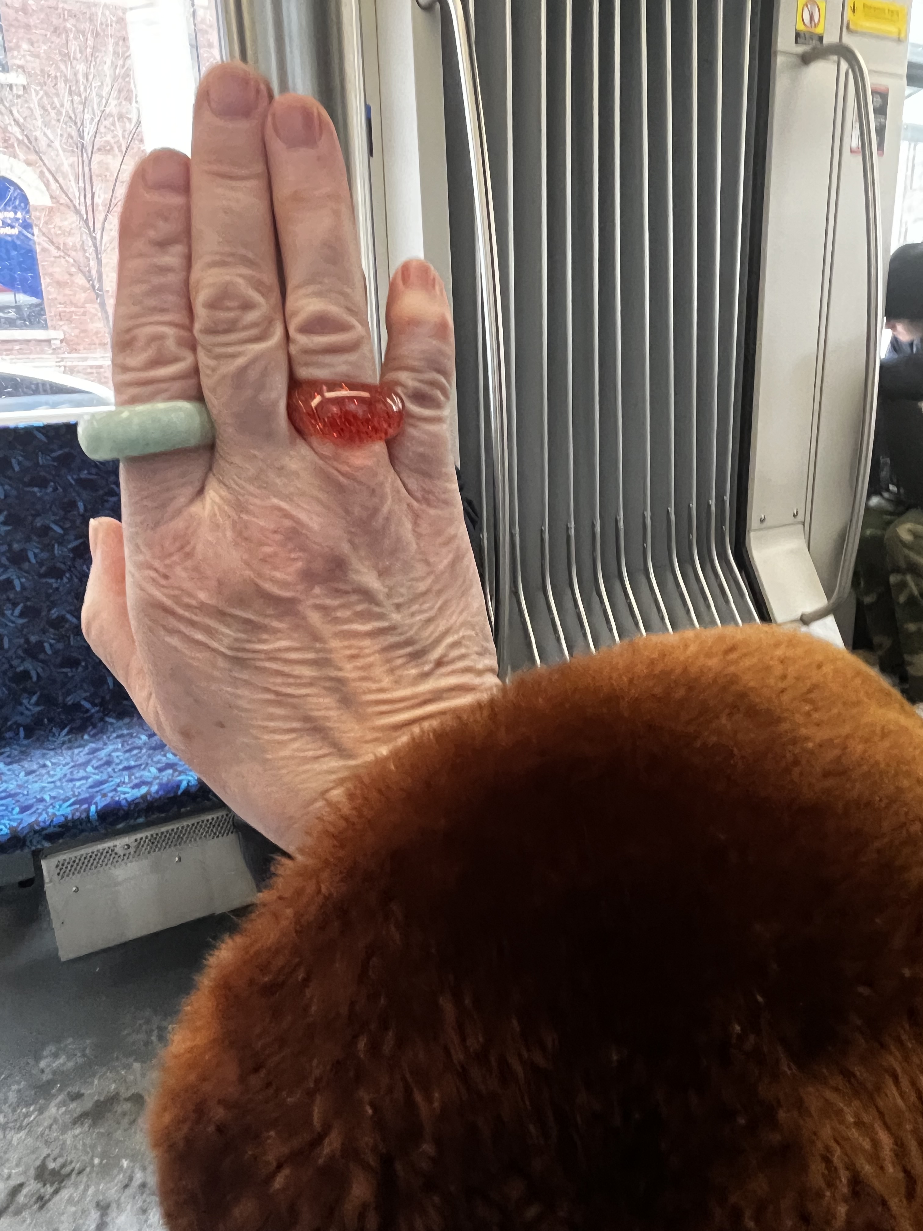 Last week, when the 75 days were up, I went on a thrift shop safari and bought a few things. Some of these gets were from my go list — ie., things that I will buy no matter what. That includes lucite rings (like the sparkler pictured up top), madras (for example the patchwork pants shown above) and L.L. Bean flannel nightgowns (see below). These things don’t present themselves very often, which is why they are on the pre-approved list.