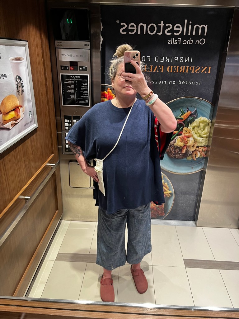 I’m in Niagara Falls because Mr. Andrew is here for a work thing for a couple of days and I am taking advantage of the fact that his hotel room is unoccupied while he is on the job to give myself a little writer’s retreat. The hotel has a pool so what better way to get some low impact exercise in as a palate cleanser in between chapters than with a little swim? What I forgot to pack was something to wear in between hotel room and fitness center. So I did a little run to the Value Village to look for a robe. I got this Tommy Hilfiger logo poncho and some chambray culottes instead.
