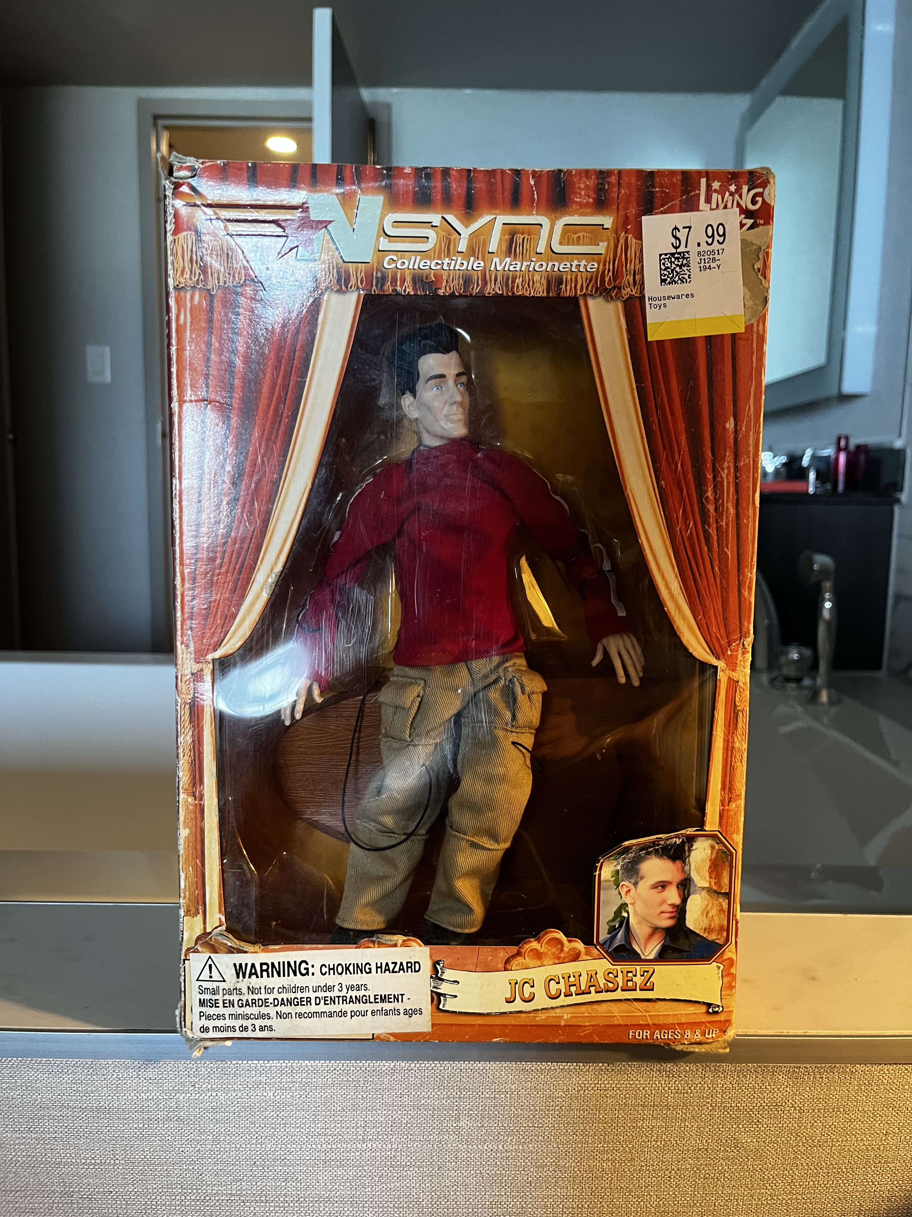 I also made some completely unnecessary purchases, including this JC Chasez marionette doll. I actually got this action figure for Christmas the year it came out. I bought him to add to my celebrity doll party project. I didn’t remember how hideous this rendition was. They had a Lance Bass as well but I passed him up because the likeness was so grotesque.