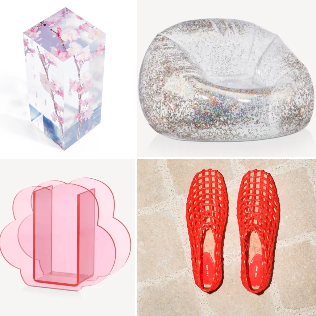 Also, I need to take some time to reassess my attraction to plastic stuff. The Sakura (from The MOMA store) in lucite is so beautiful and the orange shoes from The Row are adorable but, again, both too pricey at the moment. The sparkly chair and base both popped up on my timeline but I failed to capture who made them. I saw suspect some Temu like site, in which case it’s a no from me.