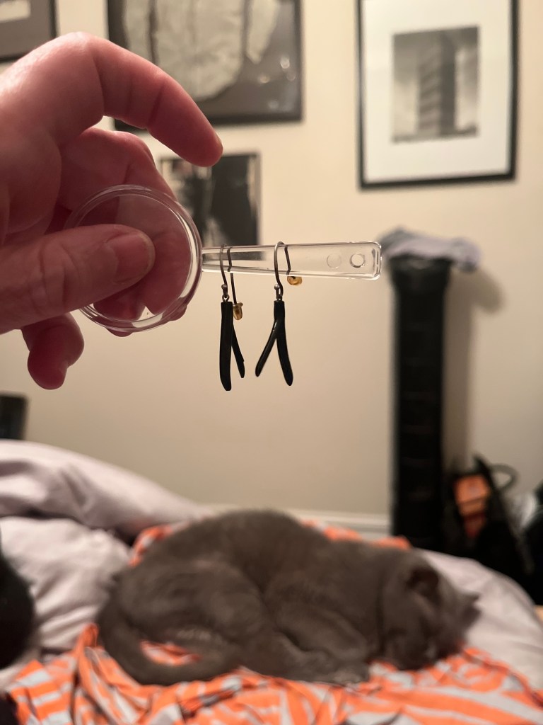 First up was these pique tortoiseshell ear pendants that were awaiting period appropriate wires to hang from. I sourced a set of engraved silver earrings with black branch coral drops and swapped them out.