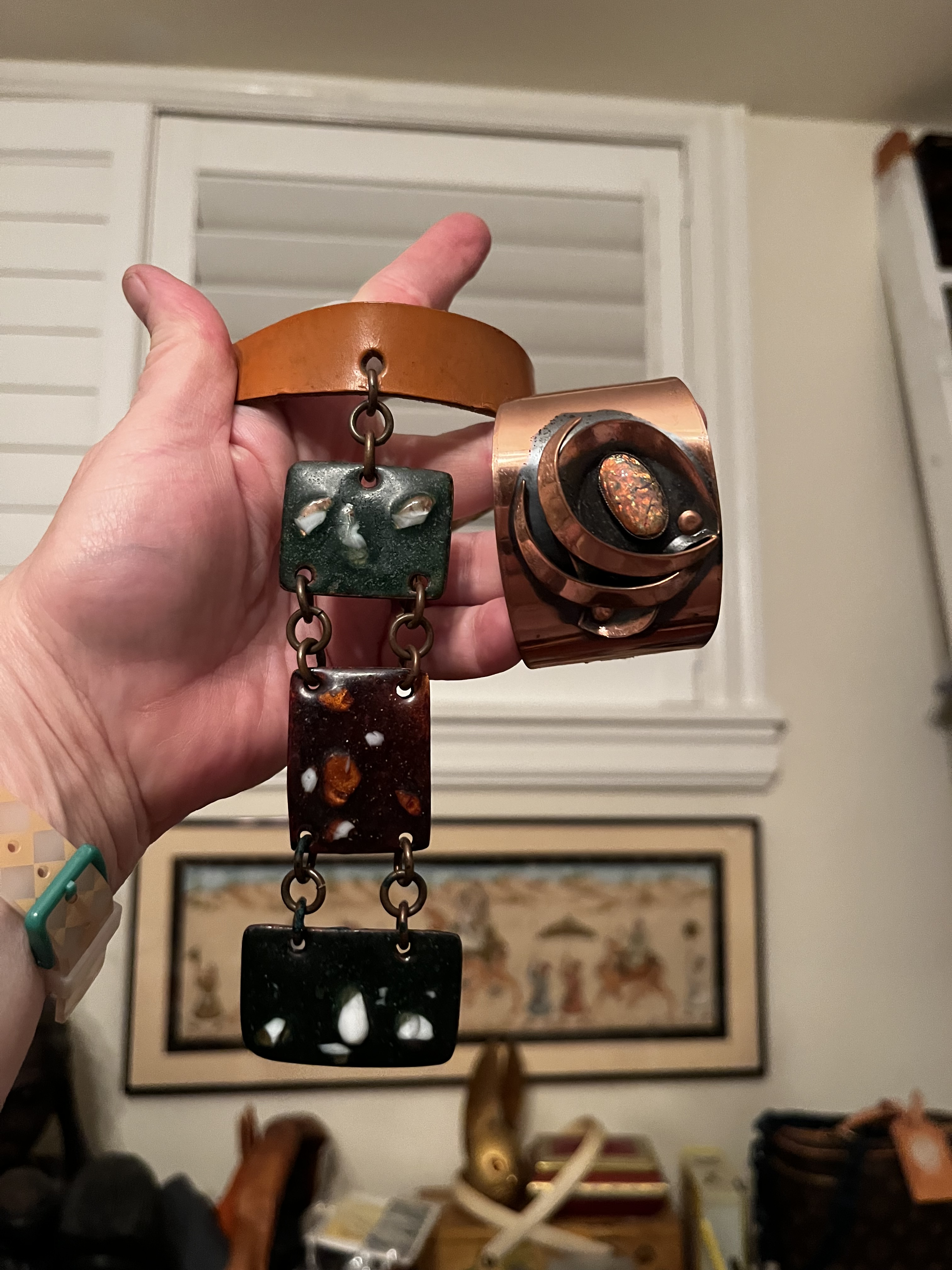 Here it is pictured with a diochratic glass and copper cuff that I found at the Goodwill a couple of months ago but never got around to writing about.
