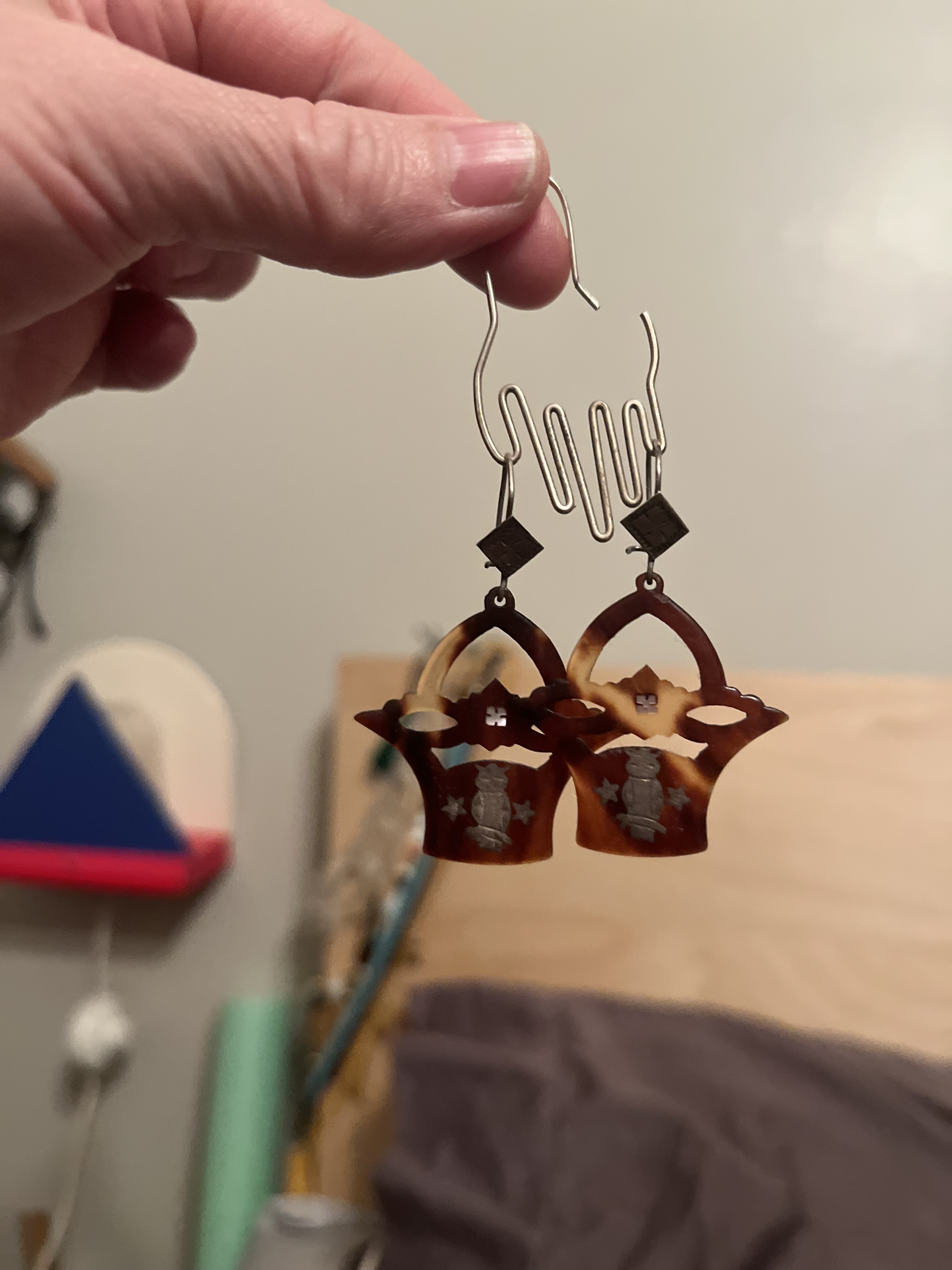 First up was these pique tortoiseshell ear pendants that were awaiting period appropriate wires to hang from. I sourced a set of engraved silver earrings with black branch coral drops and swapped them out.