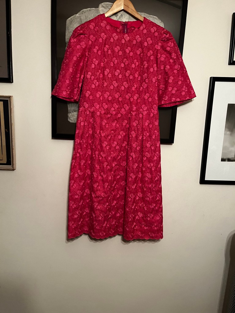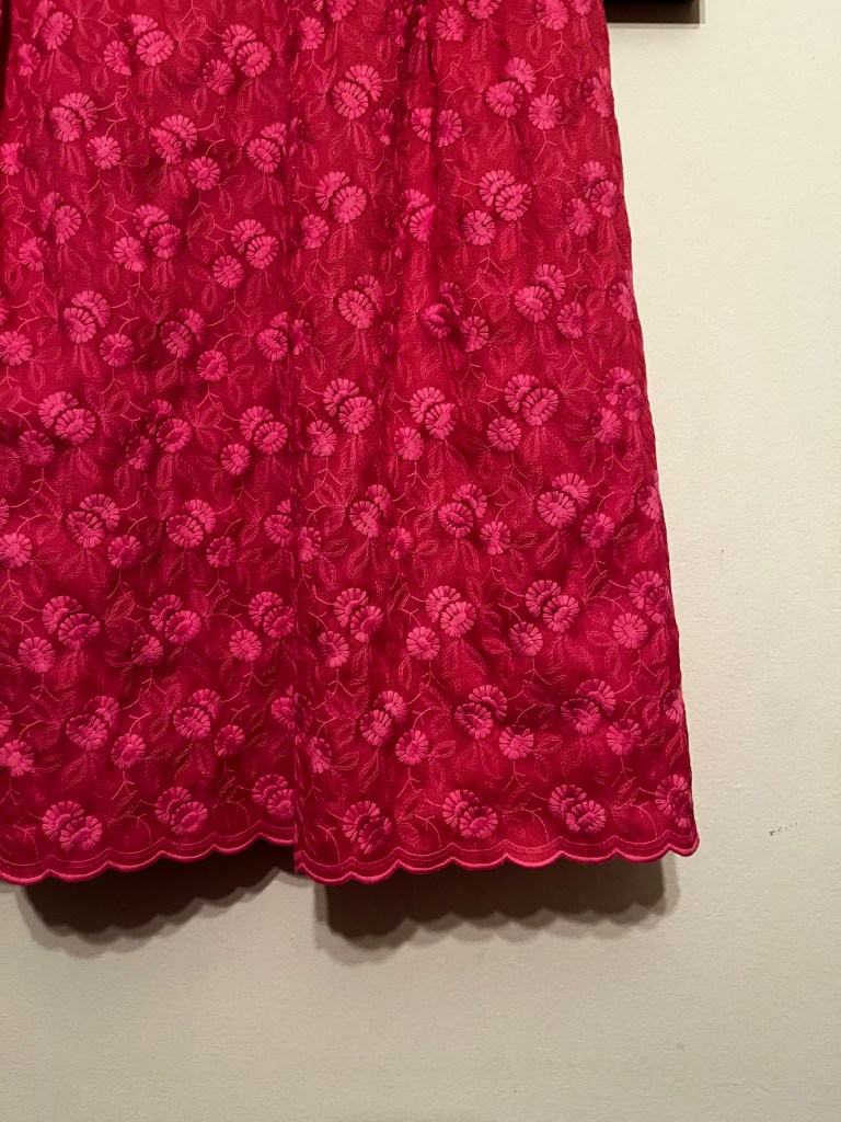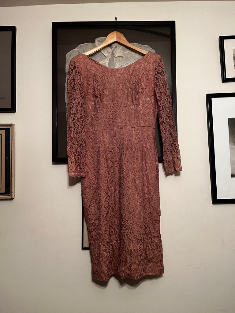 This lacy pink number is probably from the 1960s, is handmade and in incredible condition for a 60-year-old dress — no stains or tears but there is some fraying on the satin lining. Of course it doesn’t fit me but I couldn’t just leave it on the sidewalk, could I?