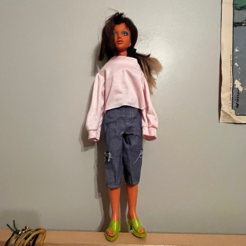 I immediately cleaned her up and detangled her twisty wig, but it has taken a lot longer to amass a wardrobe. I recently discovered that American Doll clothes fit (with a little alteration, anyway). And I’ve recently lucked out and found a few bags of them at the Value Village. Here are a few of my favourite fits.